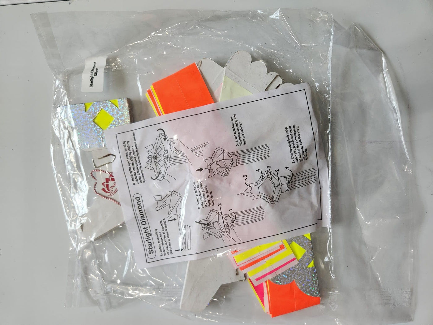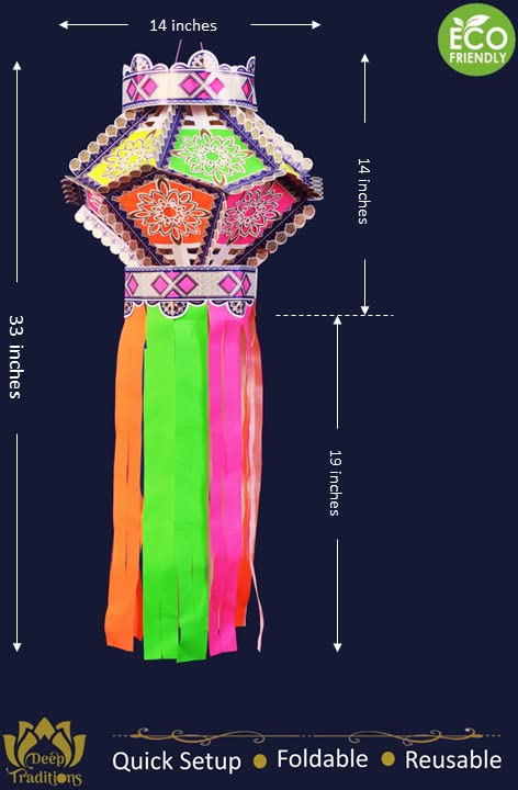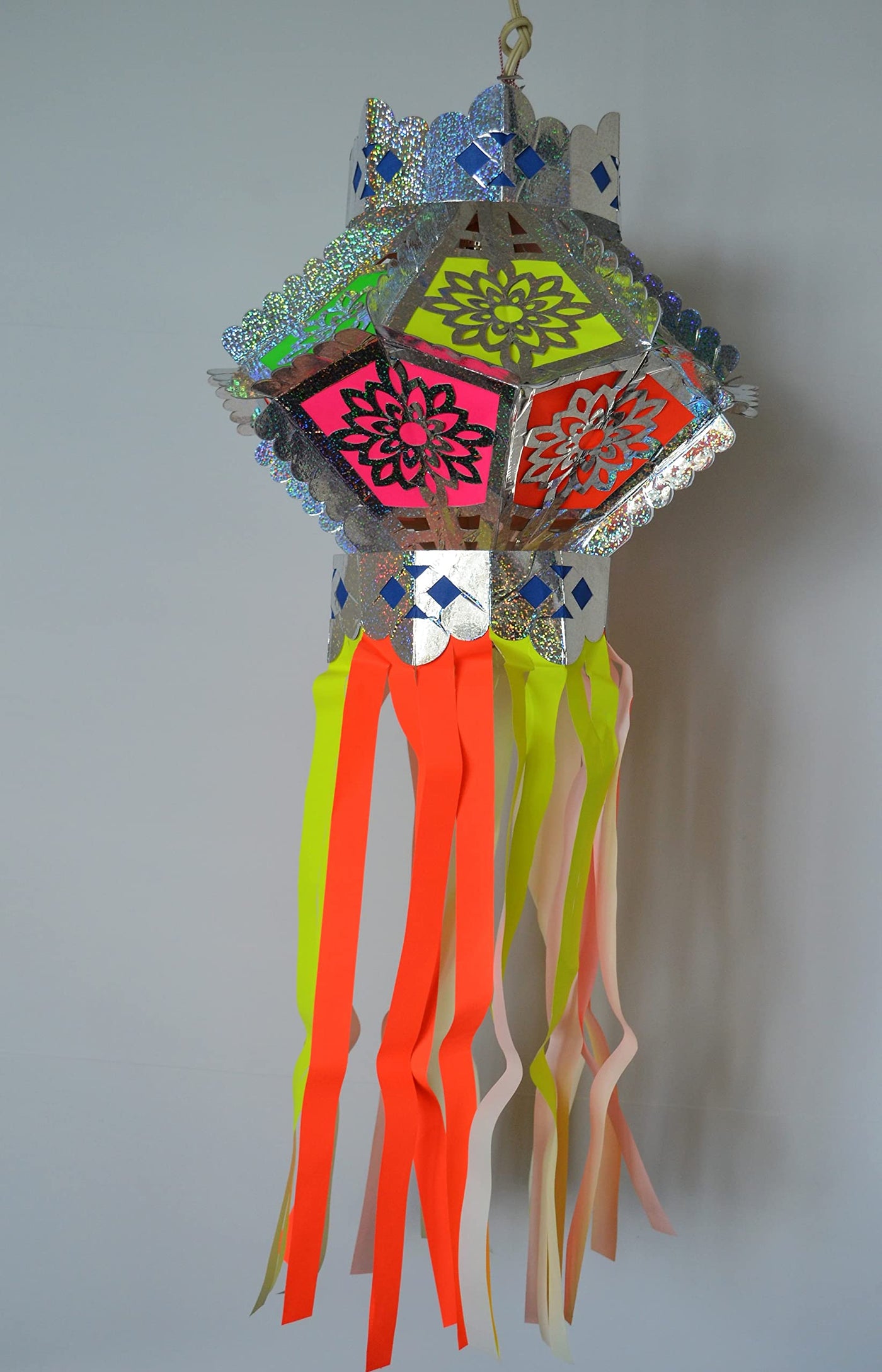 This handmade lantern is made from eco friendly hard paper and sets up easily under 2 minutes. This lantern folds easily for storage and to be reused year after year. Decorative, colorful, fiesta paper lantern. These make excellent gifts or return gifts! Included required hardware - paper clips and string to hang. *** Packed and Ships Folded. To Remove kinks and folds in the paper tail, gently run the tail through a hair straightener on the lowest heat setting or press the tail once with a clothing iron on lowest heat setting.*** ***ELECTRICAL ASSEMBLY NOT INCLUDED - WIRES, SOCKETS, PLUGS and LOW WATTAGE LED BULB***