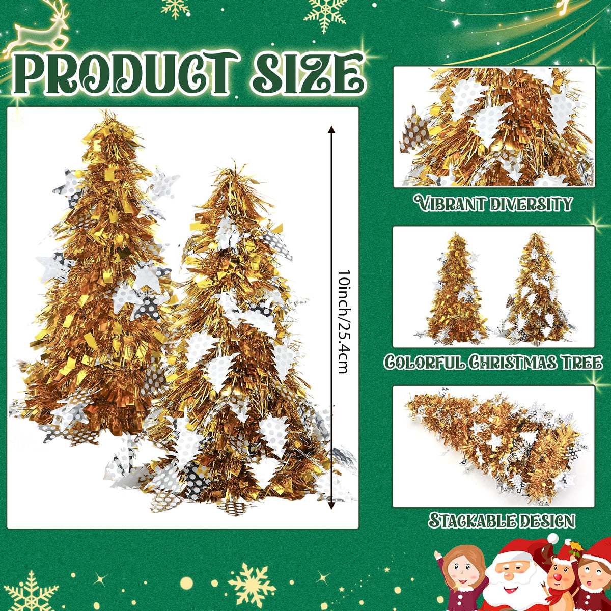 Features: Delicate design: The small desktop Christmas tree comes decorated with small trees and stars that add a hint of glitter to each piece. The shiny and glossy appearance reflects light beautifully, making it an eye catching centerpiece for tabletops during the holiday season. Quality material: Crafted with care and precision from quality material, these table top Christmas tree sets are designed to serve you for a long time. The material is not only sturdy and durable, but also safe for use around pets. Specifications: Material: quality material Color: gold Size: approx. 10 inches in height Package includes: 20 x Mini Christmas trees Notes: Manual measurement, please allow slight errors on size. The color may exist a slight difference due to different screen displays.