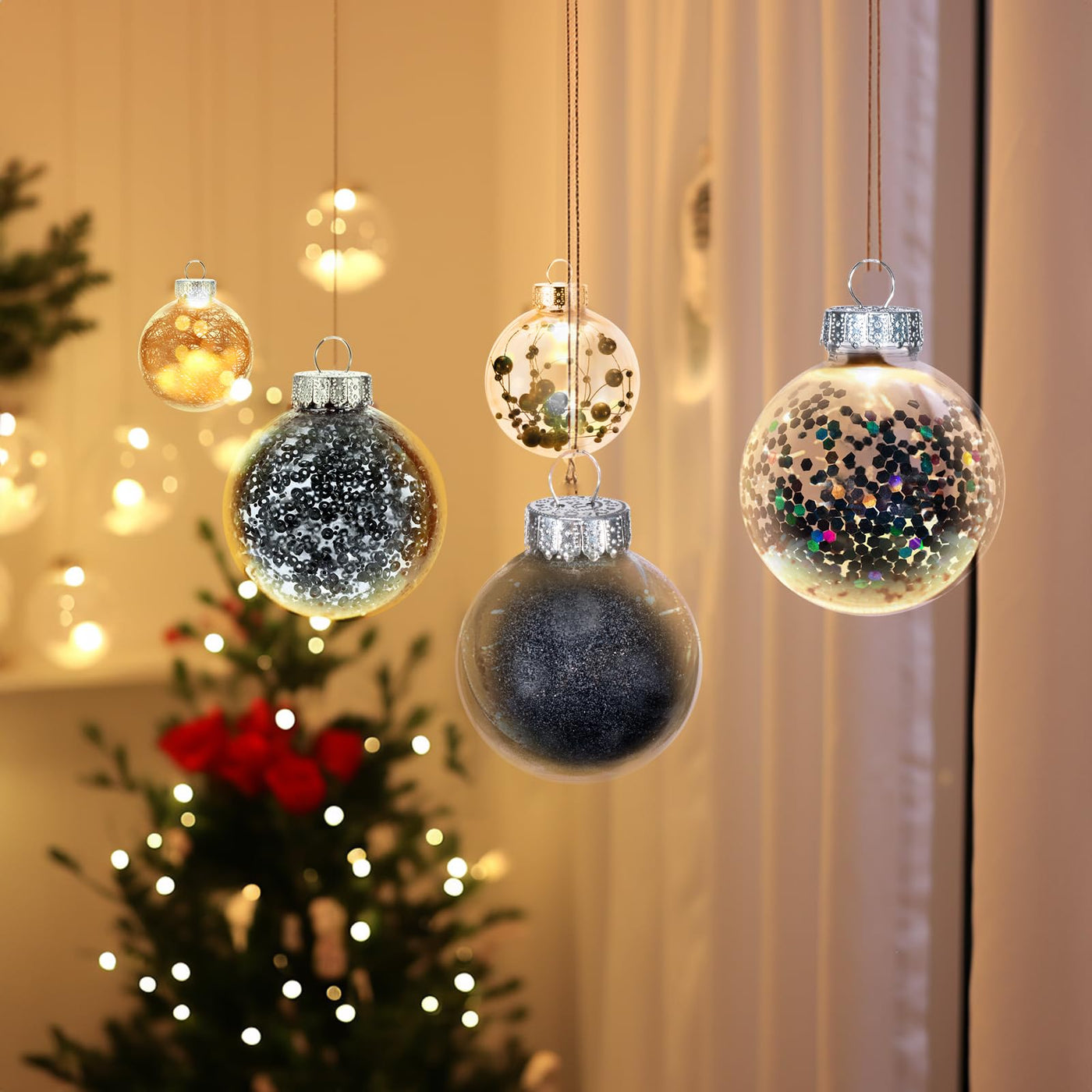 UNIVERSAL SIZE:Come with 24 pieces of 2.36''/60mm ball ornaments that fit for most Christmas trees decorations. | SPARKLING APPEARANCE:These Christmas ornaments feature sparkling decorations with clear glaze base,perfect for decorating your home and becoming part of your holiday tradition. | EASY REMOVEABLE CAP:Each ornament equips with a dismountable hook that you could take off and stuff in the clear ball with your favorite decorative little things. | EASY TO CLEAN:Those Christmas ornaments have been handmade with an innovative craftsmanship, all of the stuffings have be stuffed into the clear ball ornament and glitters glued on the inner surface of the ball. So the glitters won
