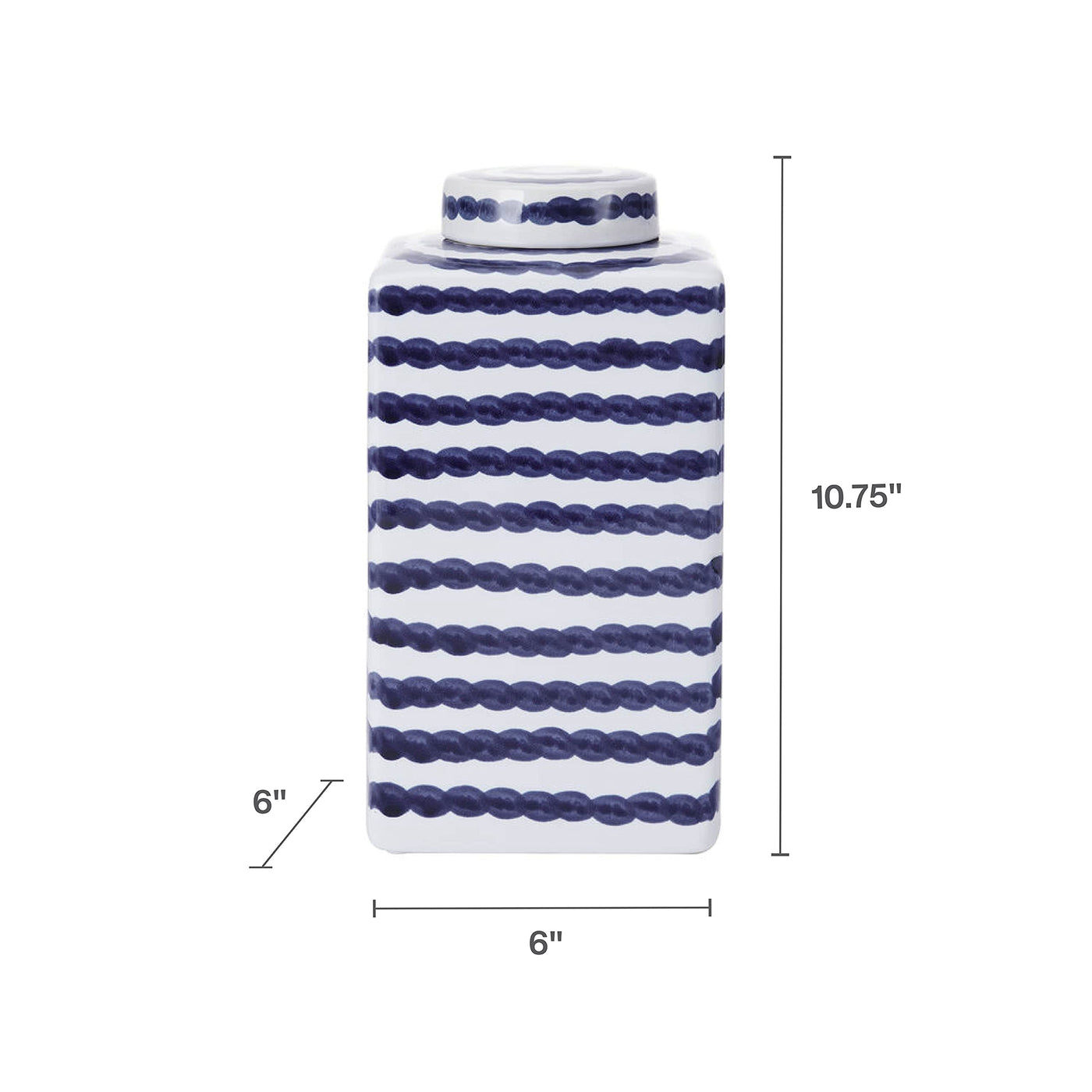 This Blue and White Ginger Jar by Mikasa features unique stripes that bring a bold look to your decor. Use this functional decor piece to store small household items or showcase faux flowers, or display the jar alone as a stunning accent piece. Place on desks, dressers, or any other tabletop piece of furniture. Makes a great gift. Measures 5.9 inch L x 5.9 inch W x 10.8 inch H.