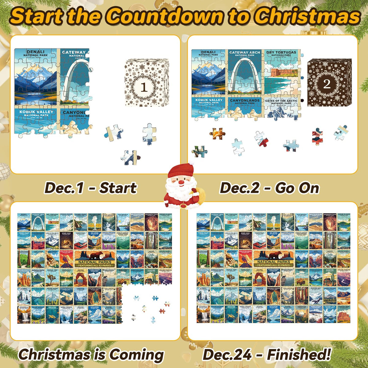 National Park Puzzle Advent Calendar 2025 Adults Teen, 1008 Pieces Coutdown to Christmas Calendar with 63 Travel Poster Landscape Jigsaw Puzzle Xmas Surprise Gifts for Family Friends