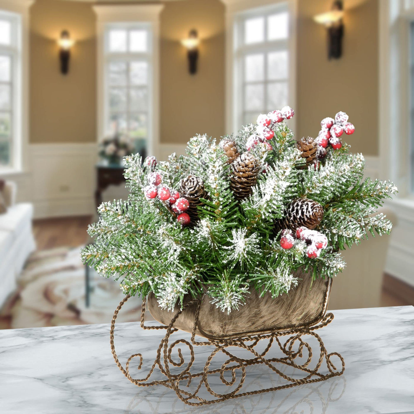 The Dunhill fir sleigh is an attractive accent piece for addition to your holiday decorating scheme. This piece features a handcrafted metal sleigh base with ornate rails. It is filled with snow-sprinkled evergreen branches, red berries and pine cones. Display this holiday trimming in indoor or covered outdoor locations.