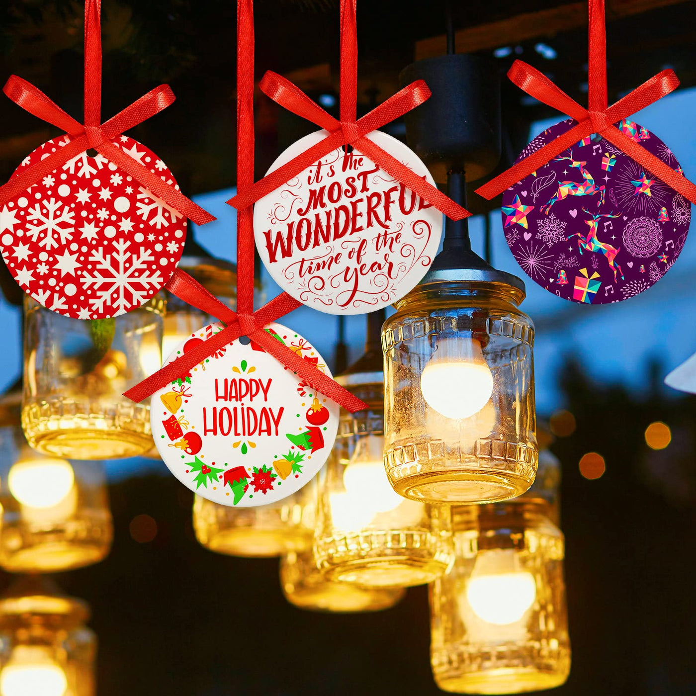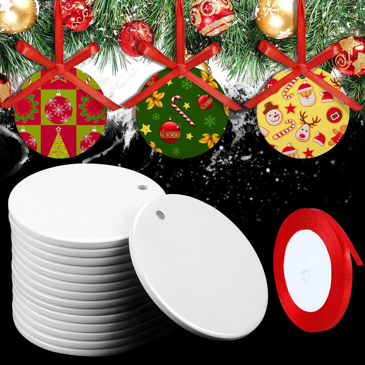 Patelai 15 Pieces Christmas Sublimation Ceramic Ornaments 3.15 Inch Round White Ceramic Christmas Ornaments DIY Blanks with Red