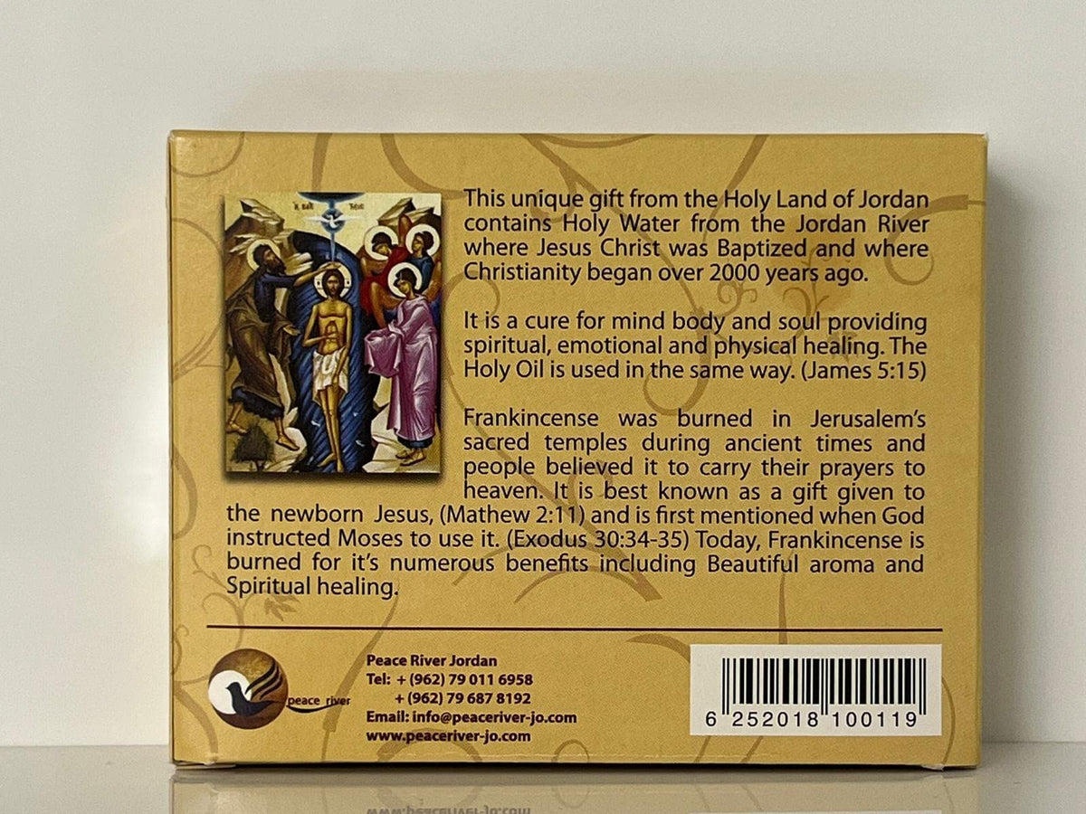 Authentic Holy Water from the Jordan River where Jesus Christ was Baptized. A Divine Gift from the Holy Land for You and Your Loved Ones. The set contains three bottles containing of Holy Water, Olive oil, and Frankincense from the Holy Land, the Baptism Site at the Jordan River and contain the Siliver Seal of Authenticity.
