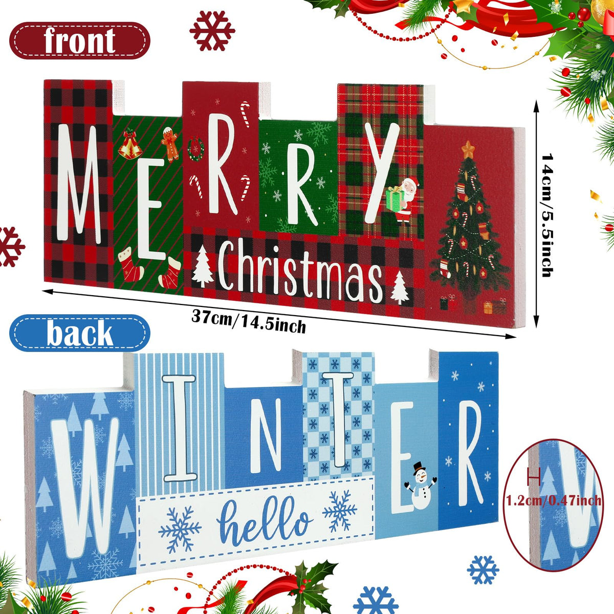 Features: Add party atmosphere: The Christmas tiered tray set is full of Christmas atmosphere, classic and exquisite, other side is full of winter atmosphere, which can help to add party atmosphere. Easy to use: Just place the Christmas wooden home decorations on the fireplace shelf, table, desktop, bookshelf, entrance table and more, you can apply them on different occasions, bringing you a comfortable using experience. Specifications: Material: wood Color: as pictures shown Size: 37 x 14 cm/14.5 x 5.5 inches in size and 1.2 cm in thickness Package includes: 1 x Reversible Christmas wooden table sign Notes: Manual measurement, please allow slight errors on size. The color may exist a slight difference due to different screen displays.
