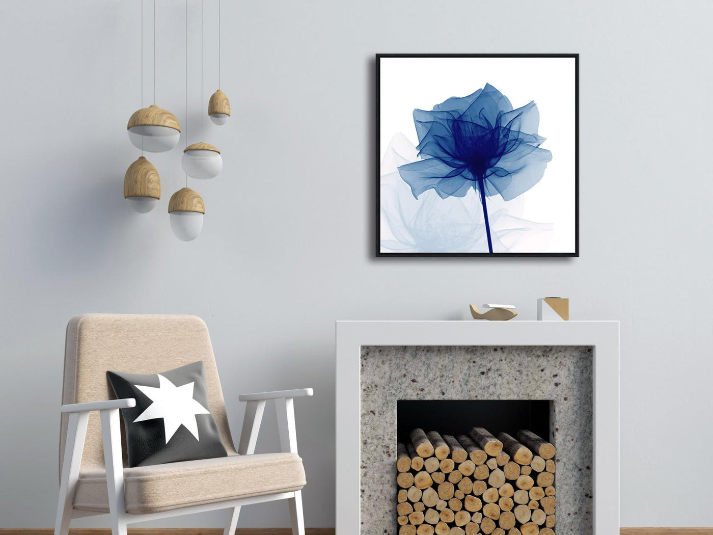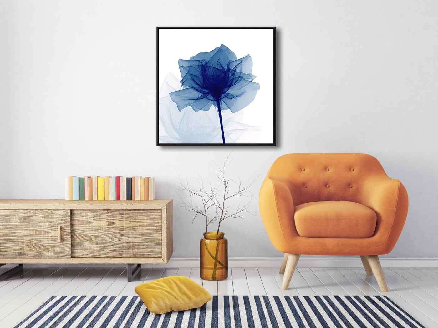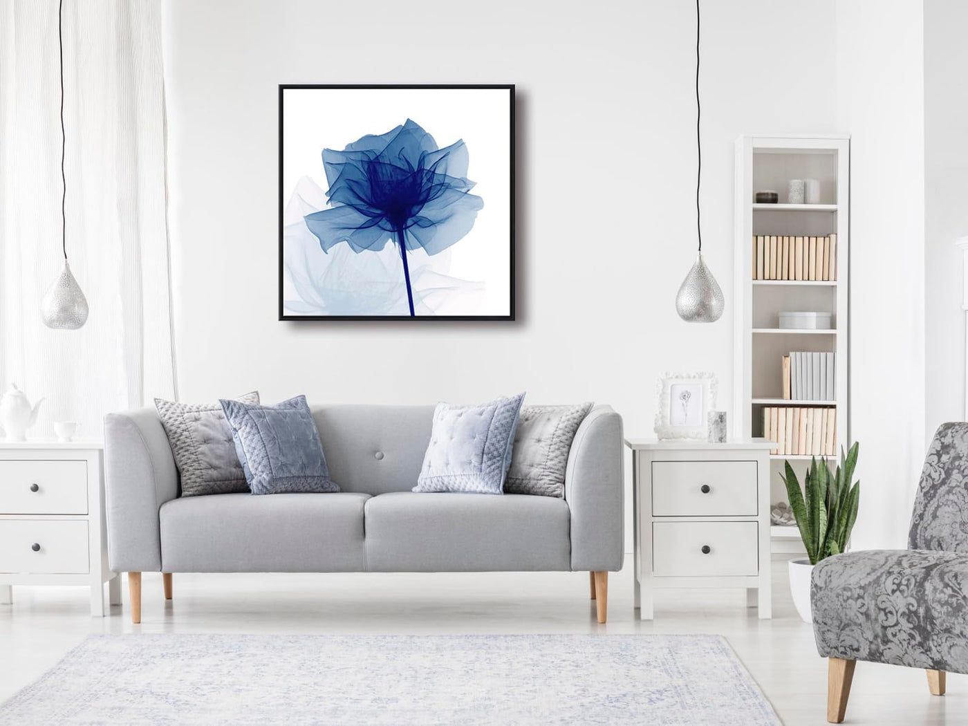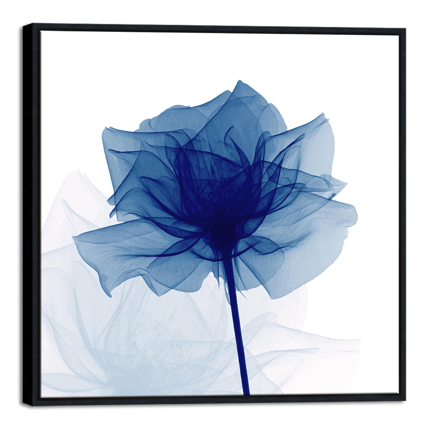 - Q: What type of artwork is this? A: This is a modern abstract painting featuring a flickering blue flower design, printed in high definition.