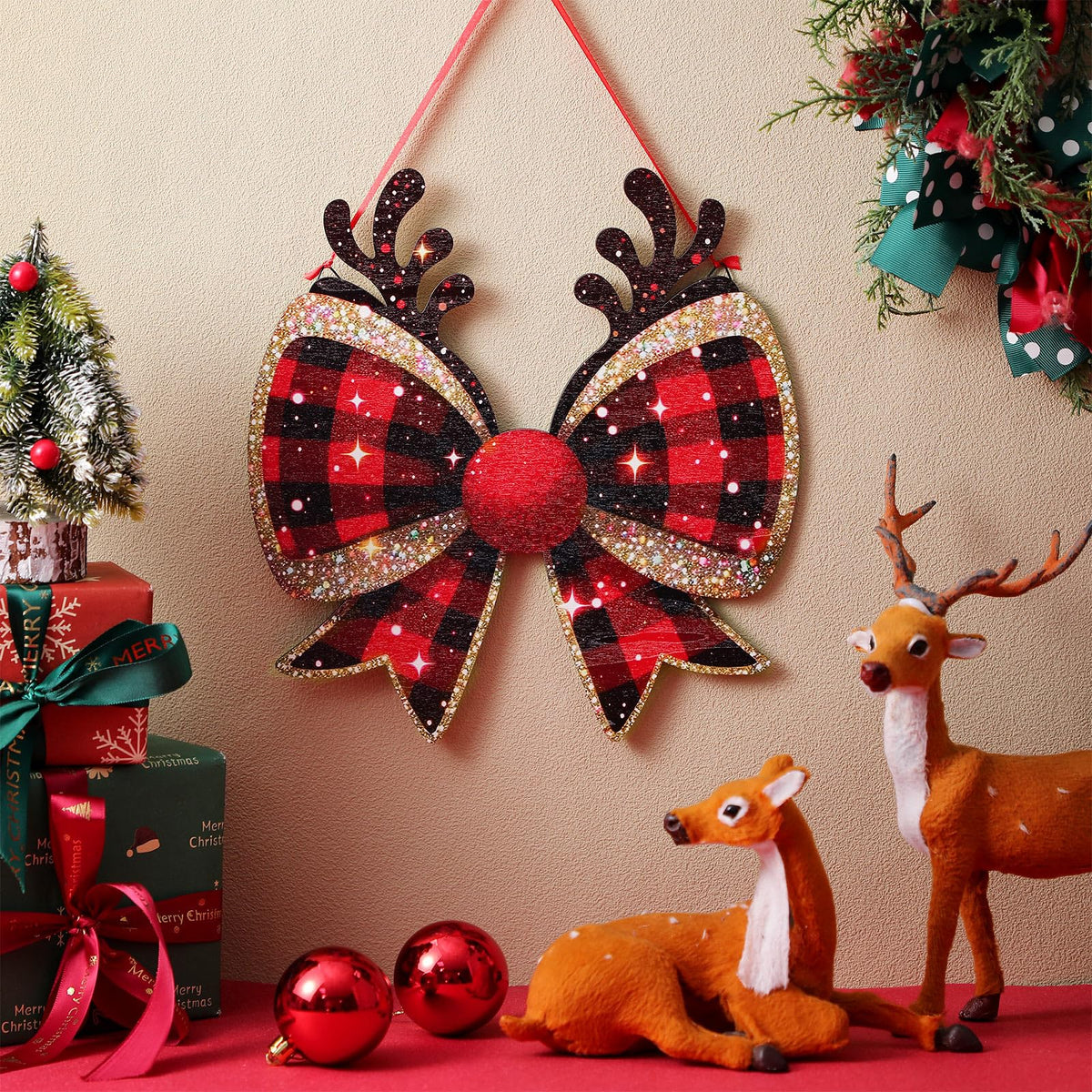 RattanView Christmas Bow Wooden Hanging Sign Red Plaid Reindeer Bow Wall Hanging Hanger Cute Preppy Wall Art Bowknot Welcome Doo