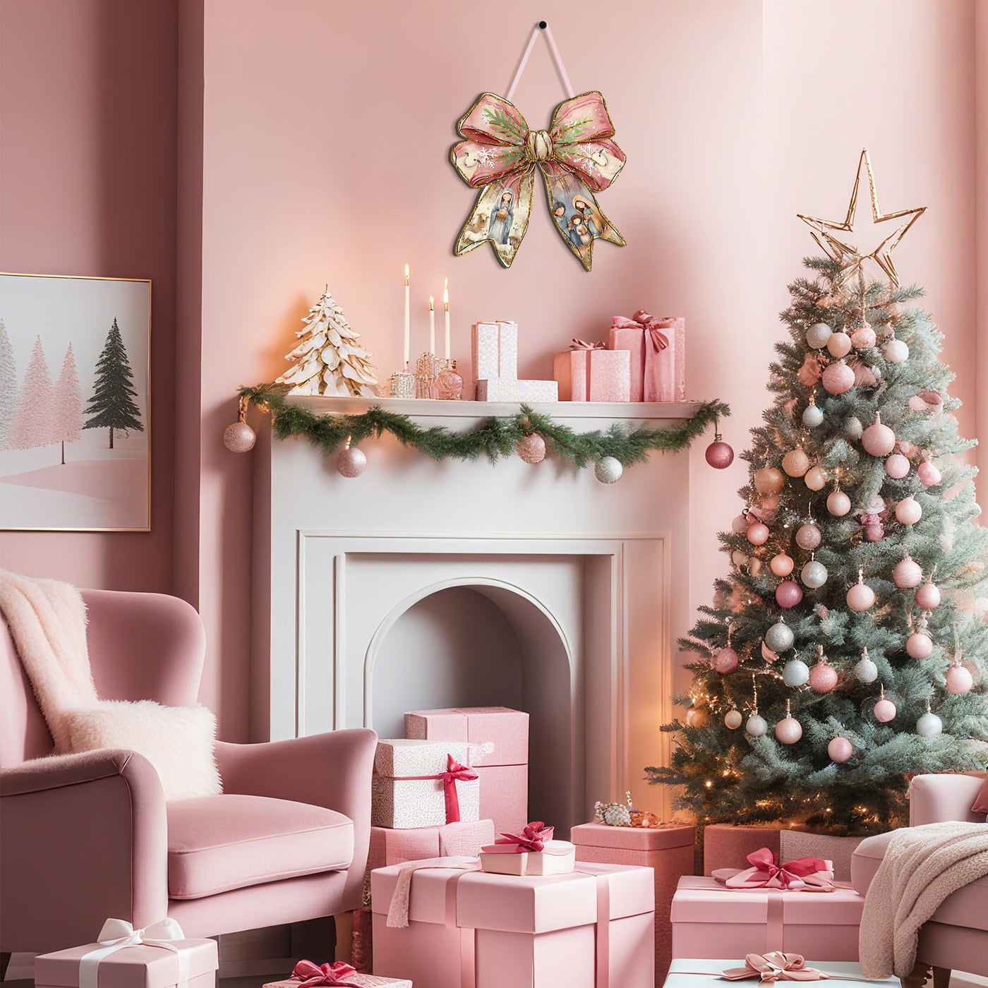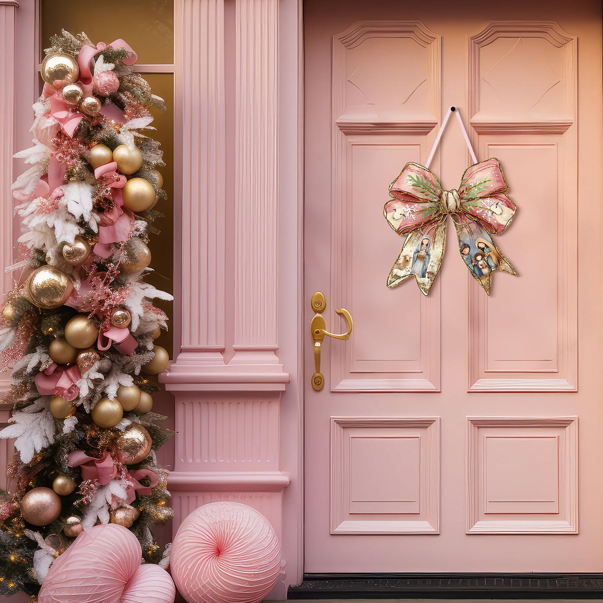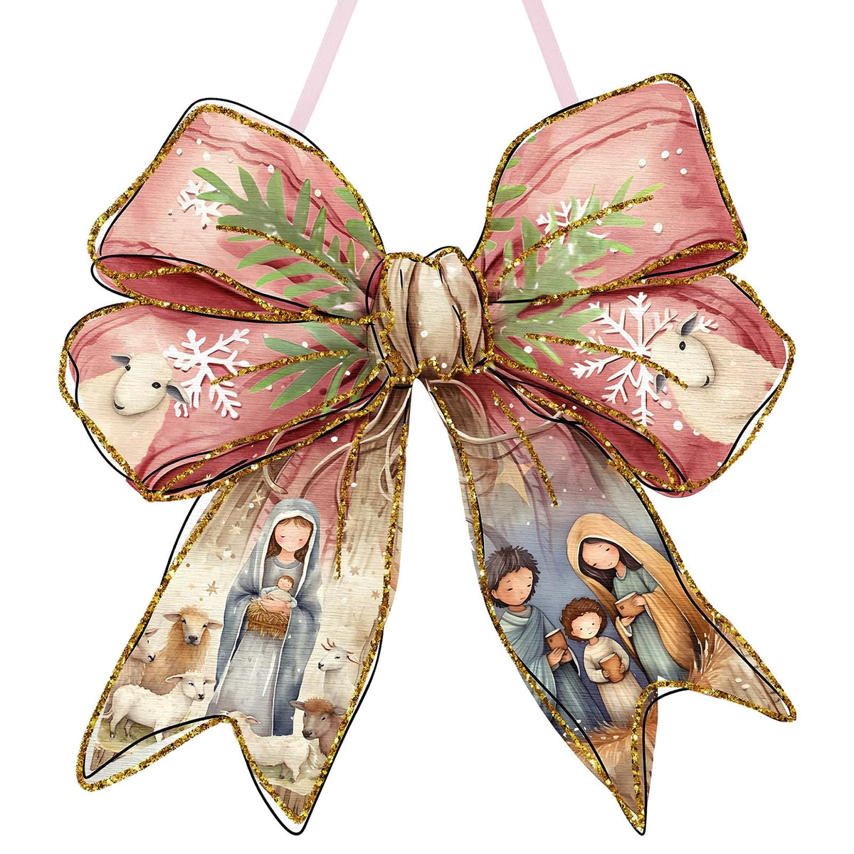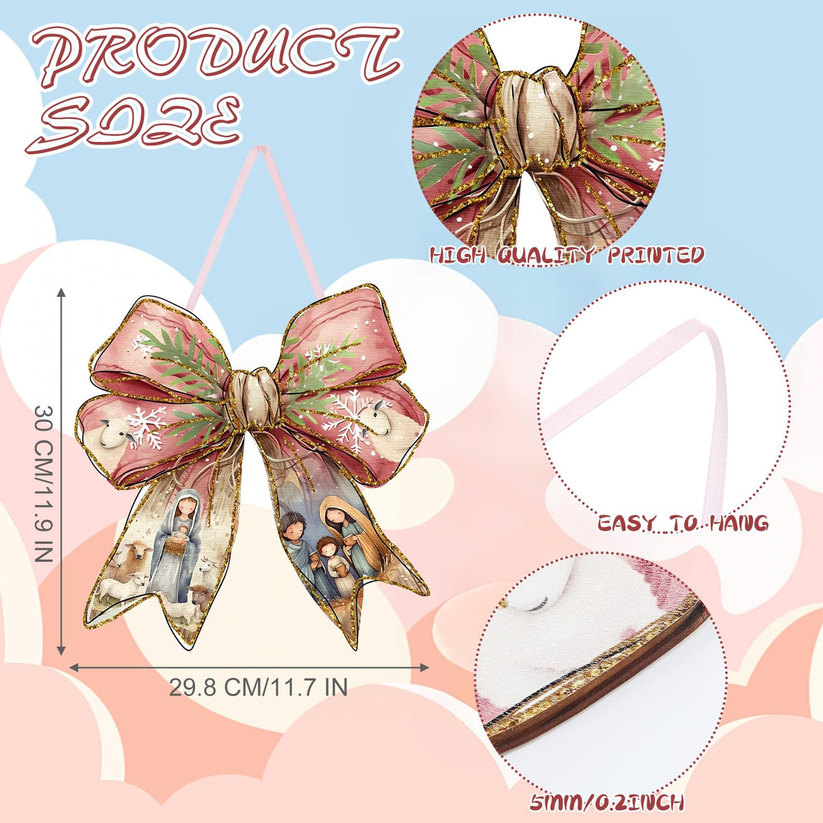 RattanView Jesus Christmas Bow Wooden Hanging Sign Coquette Bow Wall Hanging Nativity Scene Wall Art Bowknot Welcome Door Sign D