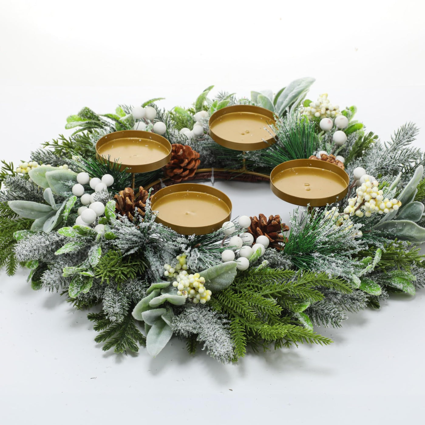 Features: This 15 large Christmas Advent Wreath Candle Holder features a rustic design with natural elements and a durable metal stand. It's versatile for various holiday decorations and makes a thoughtful gift, ensuring safe celebrations with its drip-catching candle cups. Specifications: Material: quality plastic, metal Color: green, white, brown, gold Size: 15 inches/ 38.1 cm(Diameter), Candle Cups: 3.14 inches/ 7.98 cm(Diameter) Package includes: 1 X 15 Christmas Advent Wreath Candle Holder Notes: Manual measurement, please allow slight errors on size. The color may exist a slight difference due to different screen displays