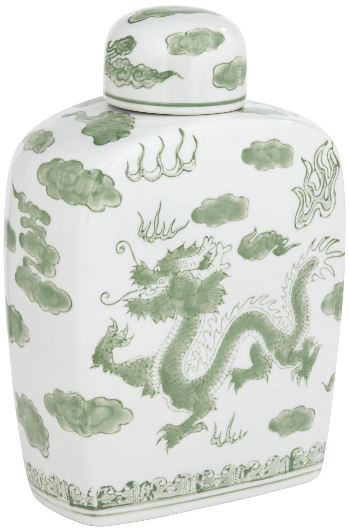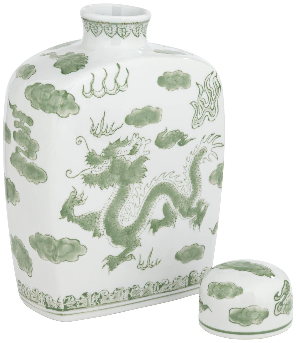 The traditional beauty of Asian decor stands out in this ceramic ginger jar, an exquisite way to boost decorative style in an indoor or outdoor space. White ceramic construction with a glossy finish adds extra elegance, with a bright green Asian-inspired dragon pattern and a romantically shapely silhouette. This lidded jar is perfect as an accent piece, but also is ideal for storage with its food-safe feature.