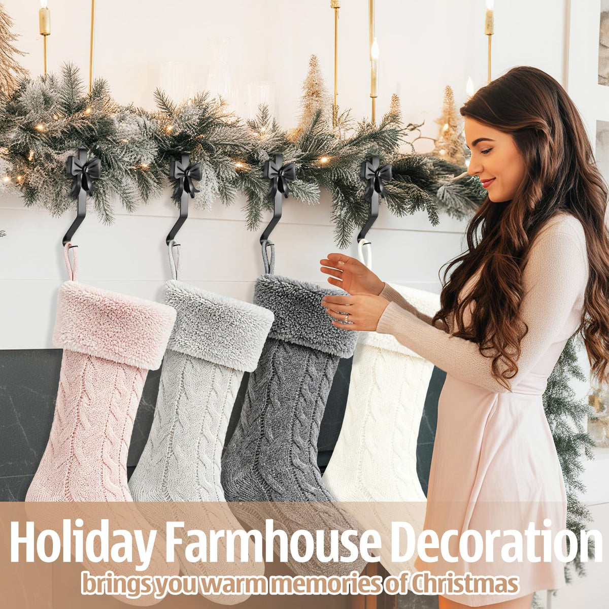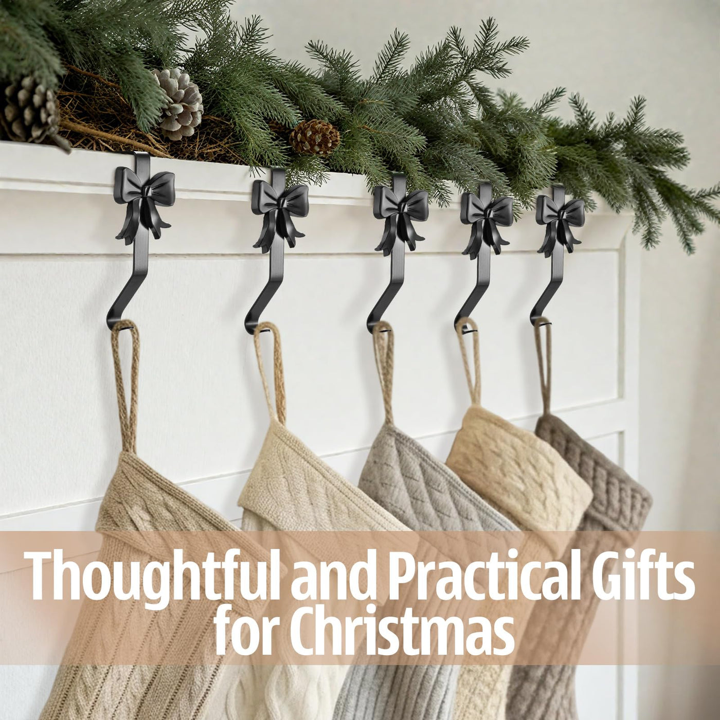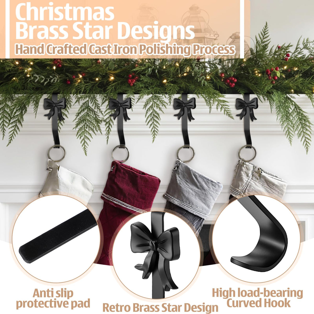 Shimeyao 8 Pcs Black Bow Christmas Stocking Holder Heavy Duty Cast Iron Stocking Hooks Non-Slip Fireplace Hangers Xmas Bow Decor
