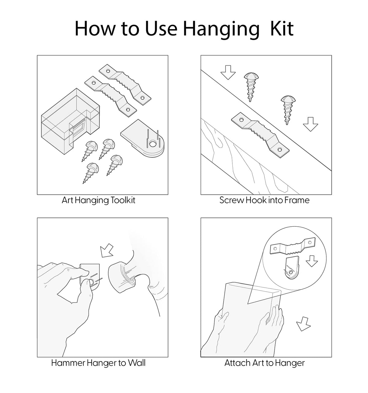 - Q: How do I hang the canvas artwork? A: Hanging is simple with the included complimentary hanging accessory toolkit.