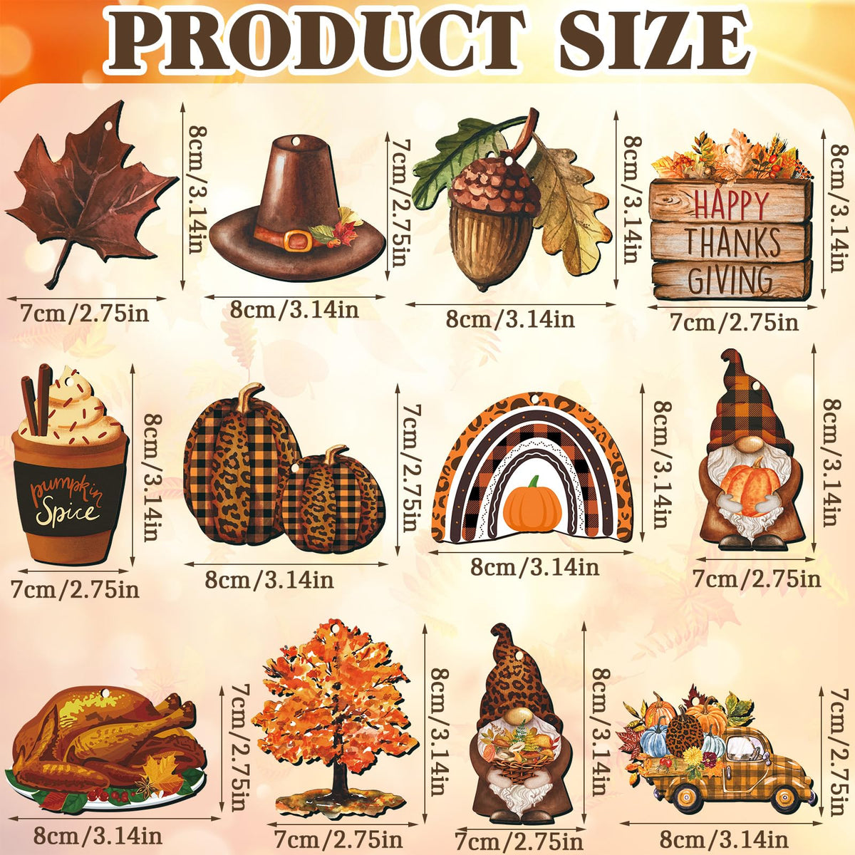 Features: The Thanksgiving wood cutouts are suitable as delicate gifts given to your family member or friend. The hanging Thanksgiving decorations can be applied to hang on your tree, fireplace, stair, door, and any other places. Specifications: Material: wood Color: as shown in the pictures Size: as shown in the pictures Package includes: 36 x Thanksgiving hanging ornaments Notes: Manual measurement, please allow slight errors on size. The color may exist a slight difference due to different screen displays.