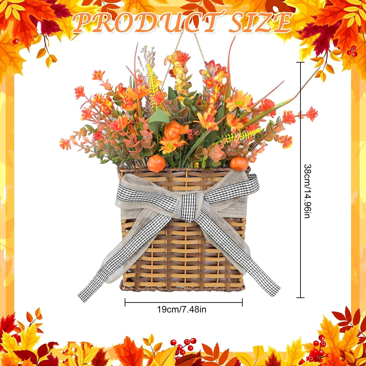 Thanksgiving Fall Door Hanger Basket Wreath Orange Pumpkin Wreath, Artificial Autumn Pumpkin Wreaths with Mixed Leaves Sunflower