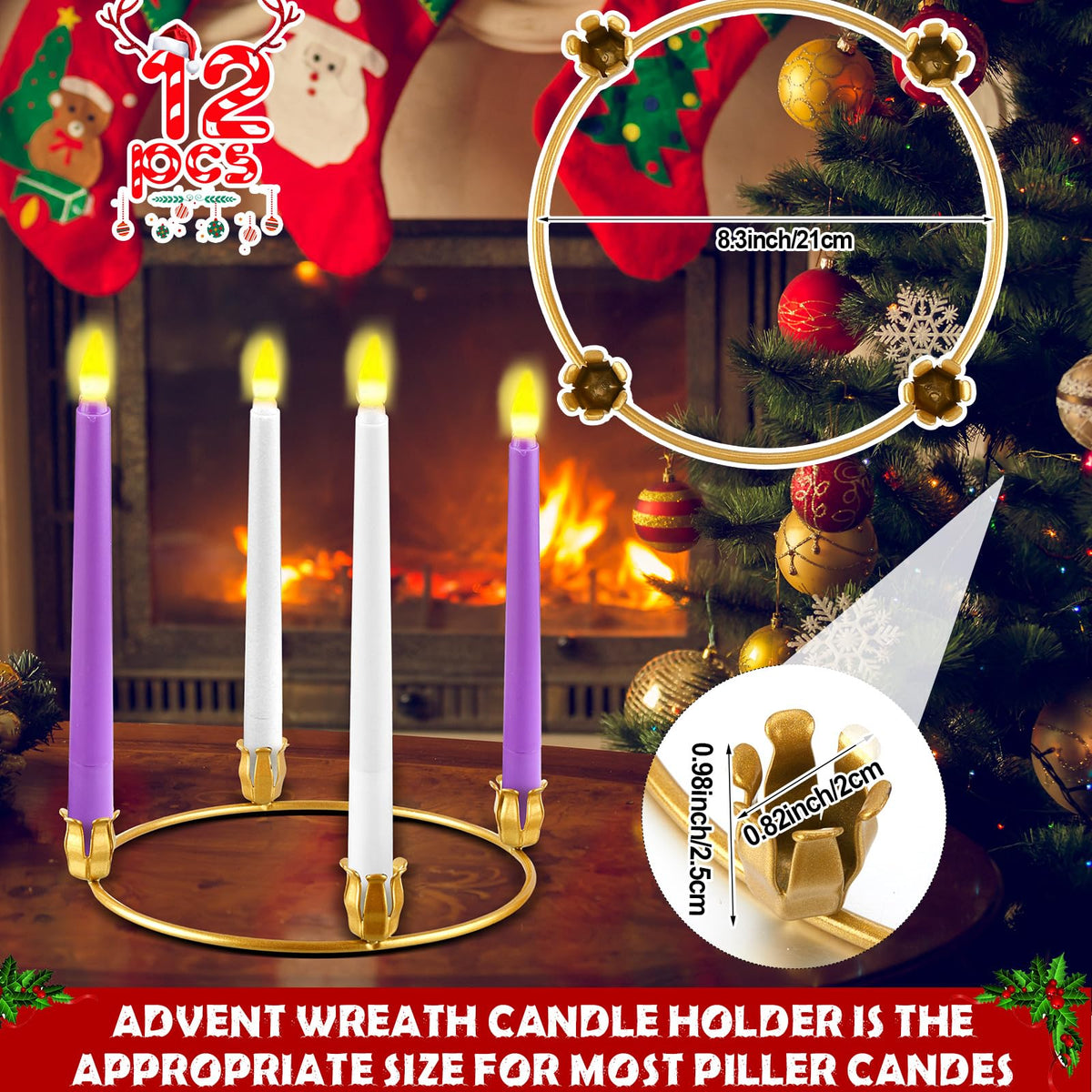 Features: These Christmas wreath candle holders are not just meant for your home, but they also make an ideal gift for loved ones, friends, and colleagues. Gift your close ones these beautiful candles holders and let them bask in the holiday too. These advent rings let you uphold this tradition in style. They not only greet the arrival of Christmas but also provide an exquisite touch to your decorations. The warm glow from these candles wreaths will create a cozy ambiance that is nice for sharing memorable moments with loved ones. Specifications: Material: metal Color: gold Size: about 8.27 inches/ 21 cm Package includes: 12 x Christmas candle rings wreaths Notes: Manual measurement, please allow slight errors on size. The color may exist a slight difference due to different screen displays.
