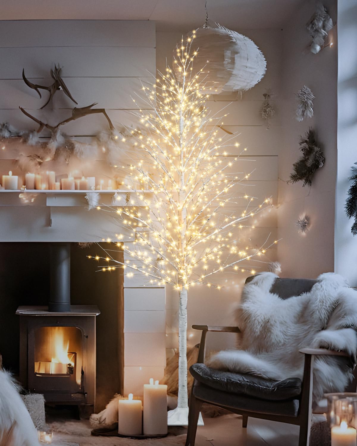 TORONTOKYO 6FT Lighted Birch Tree 910 LEDs Warm White Lights, 8 Modes Light Up White Artificial Christmas Twig Tree with Timer f