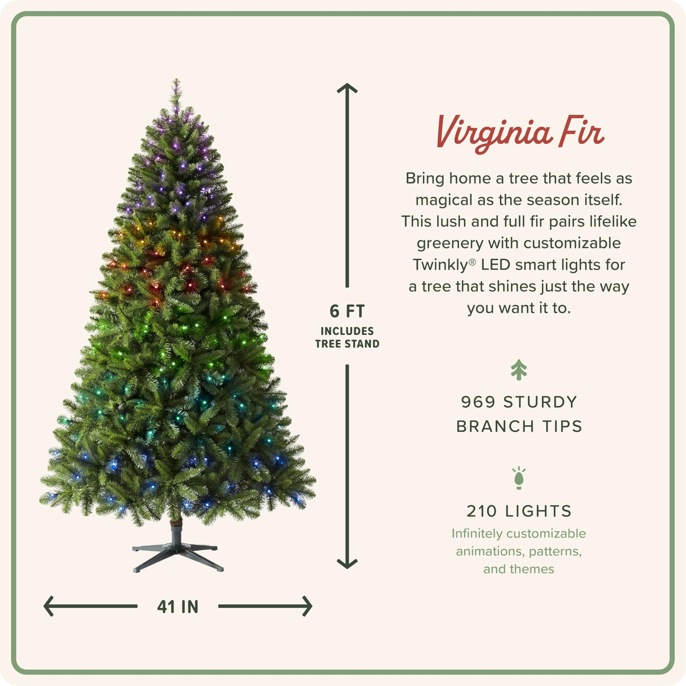 Transform your home into a holiday wonderland with the Virginia Fir artificial Christmas tree, designed for hassle-free Christmas decor. This indoor artificial tree brings festive charm to your holiday decor in 6ft, 7ft, and 8ft heights. Choose from unlit versions or prelit Christmas trees with your preference of LED clear Christmas lights or smart Twinkly tree lights with app control, WiFi, and 16 million colors. Each artificial Christmas tree features full tree branches that create a great backdrop for your holiday decor and ornaments. The hinged tree branch design makes assembly effortless, while the included Christmas tree stand ensures stability. Whether you want classic tree lights or cutting-edge smart Christmas lights that dance to music and create custom patterns, this tree adapts to your unique style and makes your Christmas decor shine.