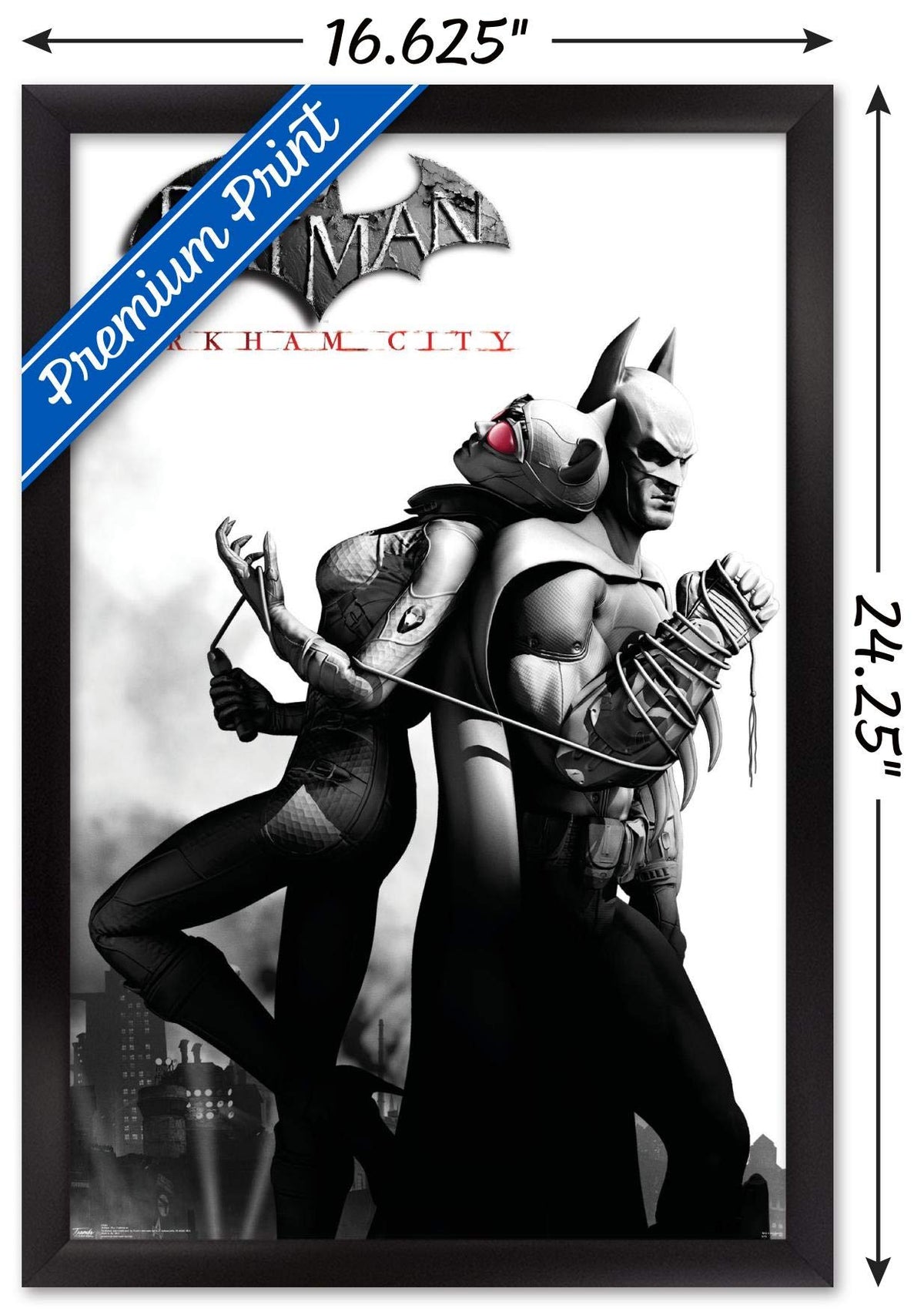 - Q: What are the dimensions of the Trends International DC Comics Arkham City Catwoman Wall Poster? A: The poster measures fourteen point seven two five inches by twenty two point three seven five inches, and the finished size with the frame is sixteen point five inches by twenty four point two five inches by three quarters of an inch.