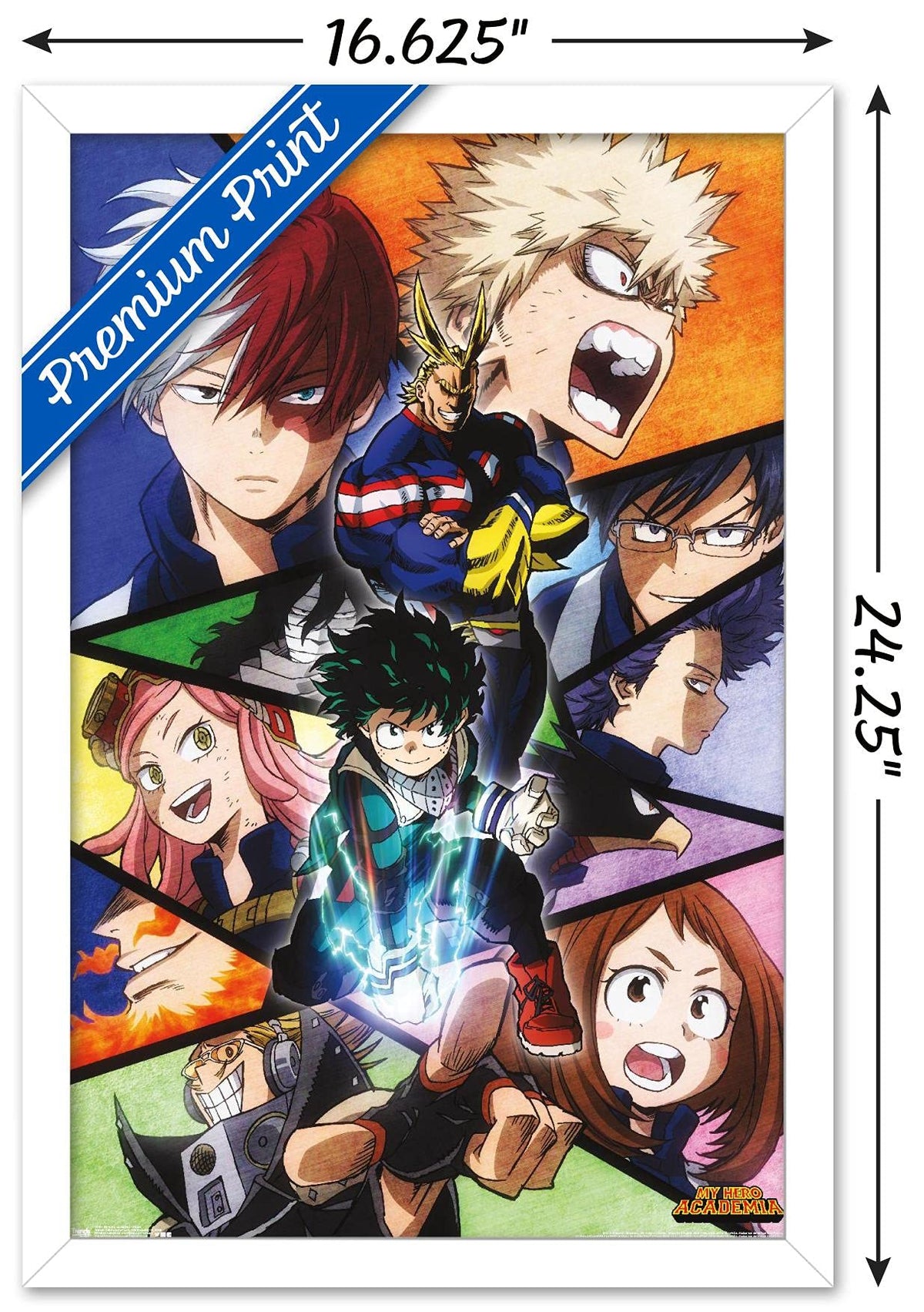 • Q: What are the dimensions of the Trends International My Hero Academia wall poster? A: The poster measures 14.725" x 22.375" and the finished size with the frame is 16.5" x 24.25" x .75".