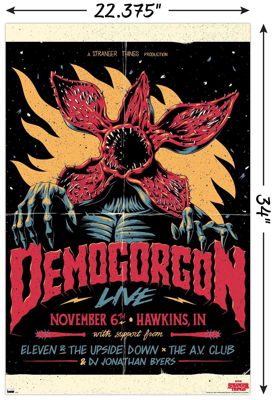 - Q: What are the dimensions of the Trends International Stranger Things Demogorgon Live Wall Poster? A: The poster measures 22.375 inches in width and 34 inches in length.