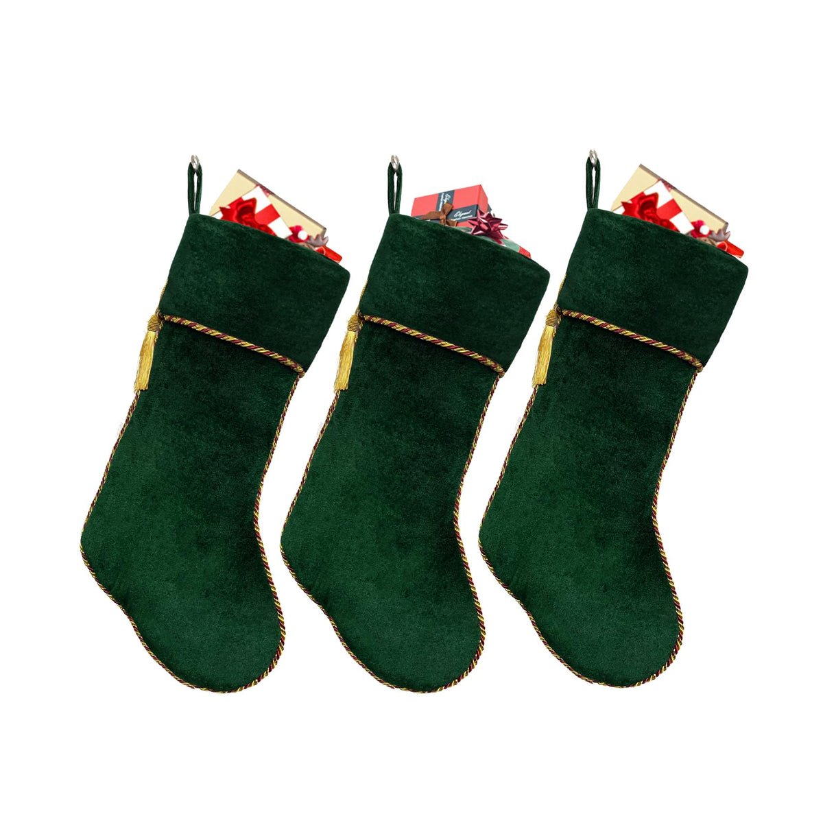 Item Features: Christmas Stockings decorations with hang loop, suitable for decorate the Christmas Tree, restaurant, hotel, club, home. Velvet Christmas Stockings with tassel decoration is perfect as Christmas gift , Christmas decorations , holiday decoration, Christmas decor, family decoration. Size: The cuff width about 7 inch, from cuff to toe length about 18 inch, from heel to toe length about 10 inch; christmas stocking has enough space to store Christmas presents, candies, small gifts, gift cards and other stuffs.Material: Our Christmas Stockings made of velvet fabric , sturdy & reusable for many years.We provide varieties of Christmas ornaments in the store, welcome to our store and find what you were looking for.