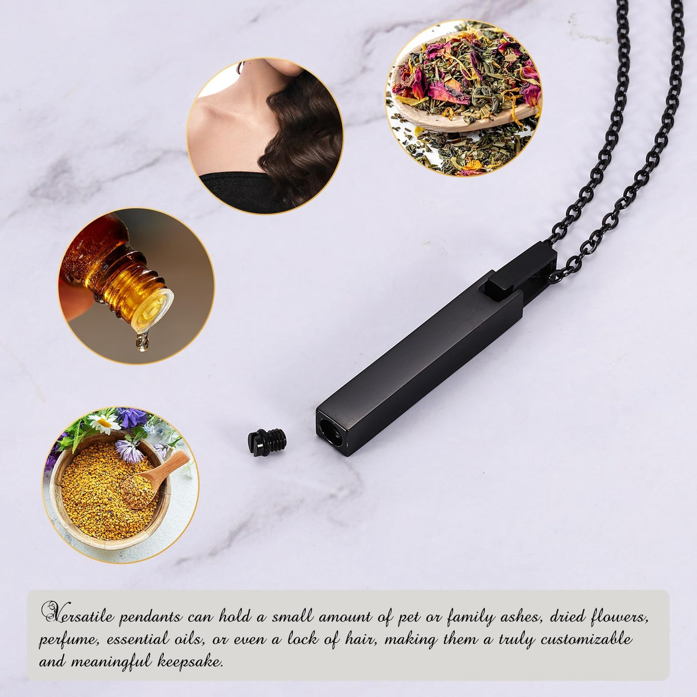 Description:Cremation Jewelry - You will never lose the memory and keep your loved one close to your heart at all times, they will always be with you, and keep memories close at heart. Carry it with you where you are closest to the heart, as a decoration, or as a great way to your loved ones.Multi-function Necklace - The Waterproof Keepsake Pendant is suitable for memorial purposes. The interior of the pendant is empty and you can put small quantities of dried flowers, perfumes, essential oils, locks of hair, clay, or sand. Unique Gift - The ashes chain has a beautiful velvet pouch and filling kit. A simple and delicate urn necklace is a great gift to give in memory of a loved one, preserving precious memories beautifully.Specification:Size: 40 x 5.5 mm/1.6 x 0.2 inches(L*W)Length: 550mm/21.7 inchesShape: CubeColor: Rose GoldPackage Content: 1 x stainless steel pendant necklace, 1 x funnel, 1 x mini screwdriver, 1 x velvet bag, 1 x gift box, 1 x spoon and 1 x cloth