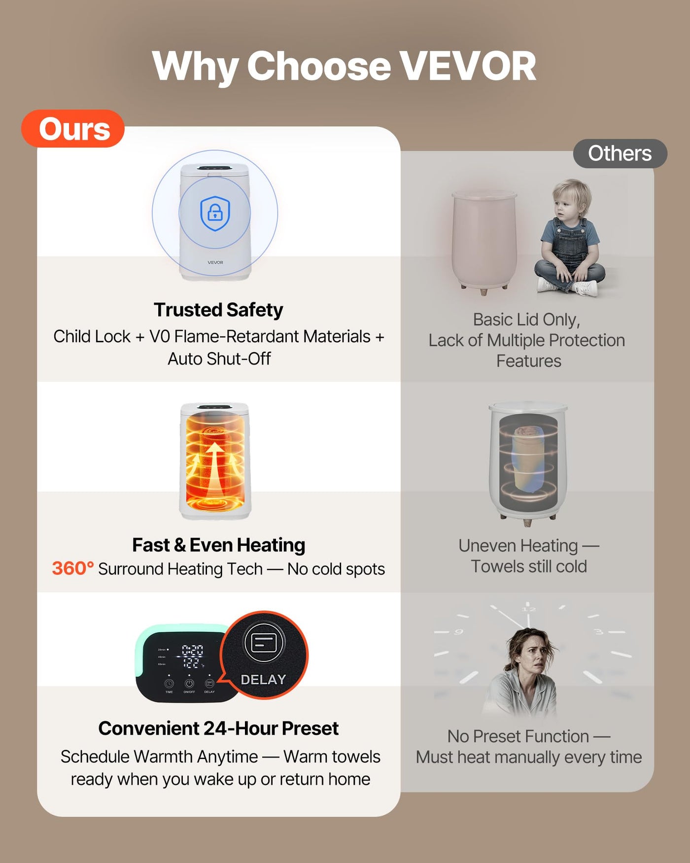 VEVOR Towel Warmers for Bathroom, Towel Warmer Bucket with Child Lock & High-Temp Light & 24H Delay Timer & Auto Shut Off Fits u