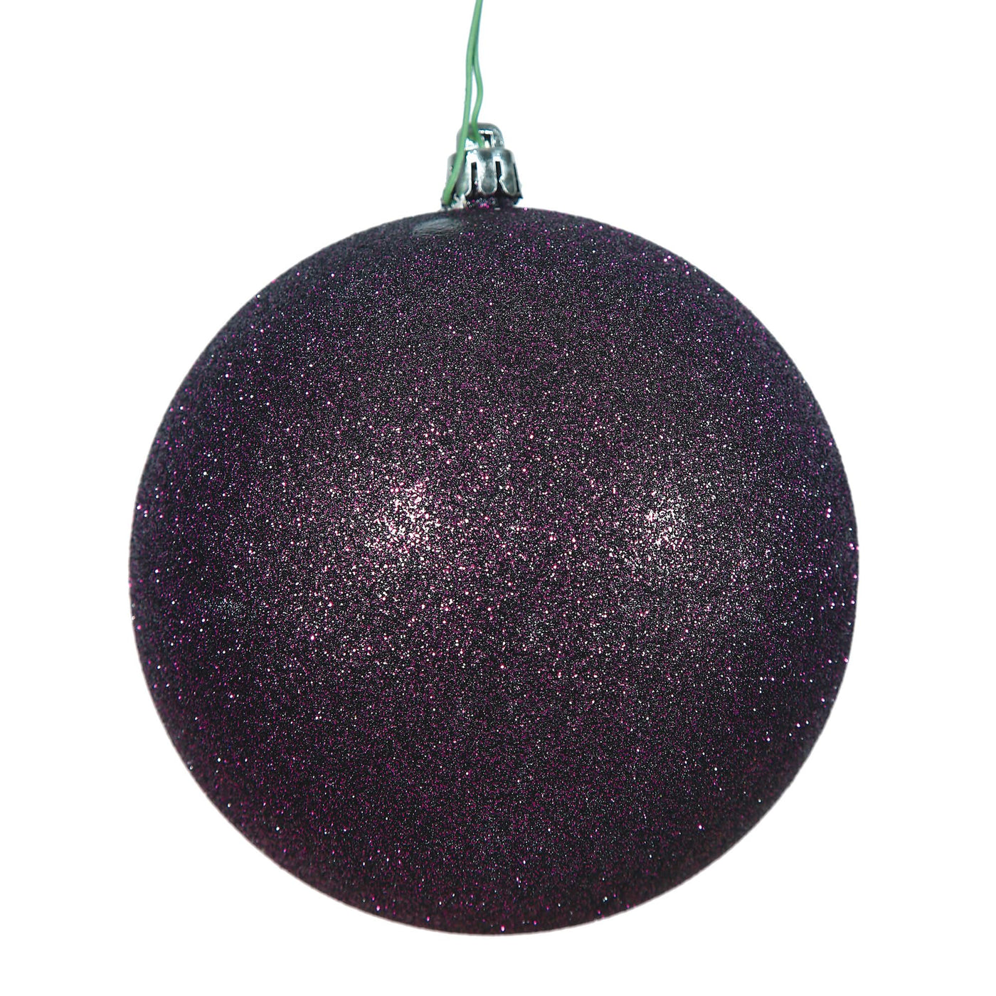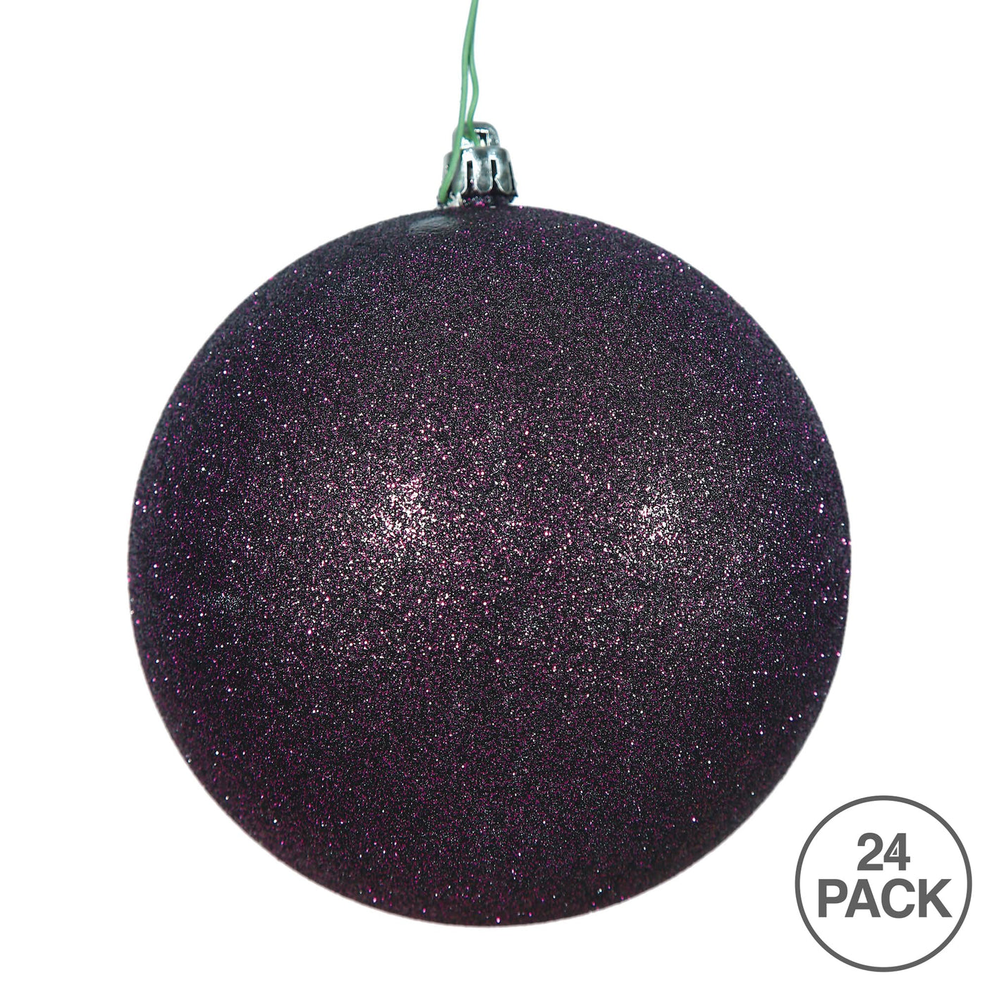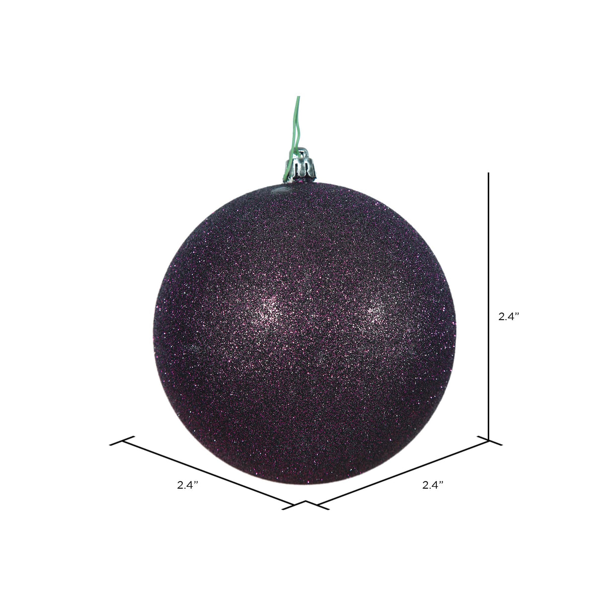 Vickerman 2.4 Plum Glitter Ball Ornament. This ornament features glitter finish that will add shimmer to any holiday decorating project. This item is made from shatterproof plastic and utilizes a drilled and wired secure cap for reliable hanging. This unique ornament is an exceptional addition to any collection as it matches well with a variety of d cor and goes perfectly on a holiday tree. Includes 24 ornaments per pack.