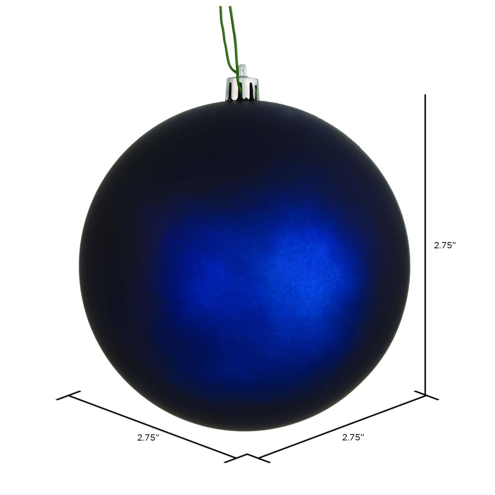 Vickerman 2.75 Midnight Blue Matte Ball Christmas Ornament, 12 ornaments per pack. Features a rich matte finish. This ornament is made from shatterproof plastic protecting it against accidental drops. Shatterproof ornaments are kid and pet friendly and safe for the entire family to help hang on the tree. Drilled & Looped - Hang your ornaments with peace of mind using our drilled and looped features. With drilled and looped ornaments, the cap is decorative and the ornament itself is secured to the tree with floral wire ensuring your ornaments will stay in place for as long as your tree is up. Tru-UV coating protects this vibrant ornament against fading from exposure to sunlight. Tru-UV coated ornaments come with a 2 year seasonal warranty. This unique ornament is an exceptional addition to any collection as it matches well with a variety of d cor and goes perfectly on a holiday tree. Vickerman has been an industry leader since 1940. Enjoy this expert designed ornament in your home.