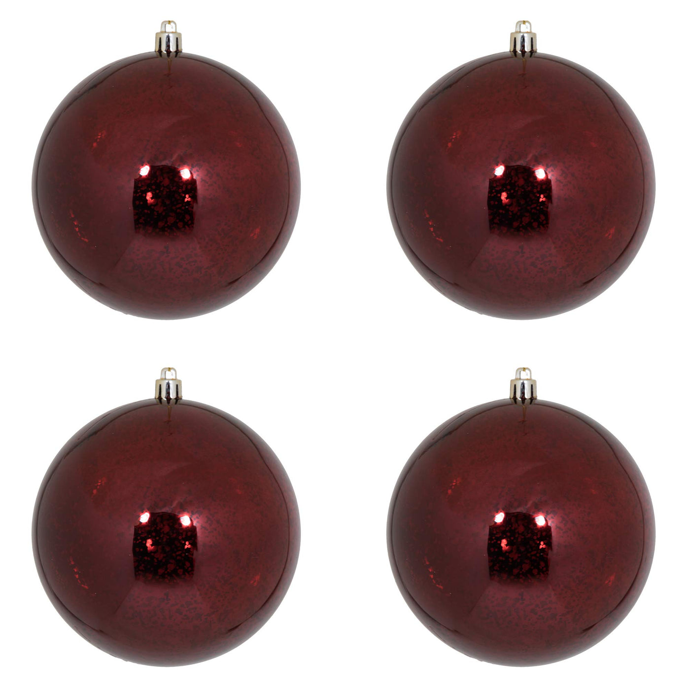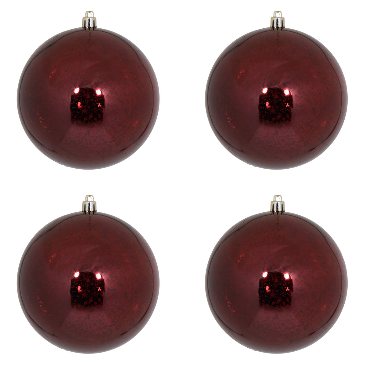 Vickerman 4.75 Burgundy Shiny Mercury Ball Christmas Ornament 4 Pack. This ornament is made from shatterproof plastic and features a rich shiny mercury finish. Shatterproof ornaments are kid and pet friendly and safe for the entire family to help hang on the tree. Sturdy design featuring a drilled and wired secure cap for reliable hanging. This unique ornament is an exceptional addition to any collection as it matches well with a variety of d cor and goes perfectly on a holiday tree. Vickerman has been an industry leader since 1940. Enjoy this expert designed ornament in your home.