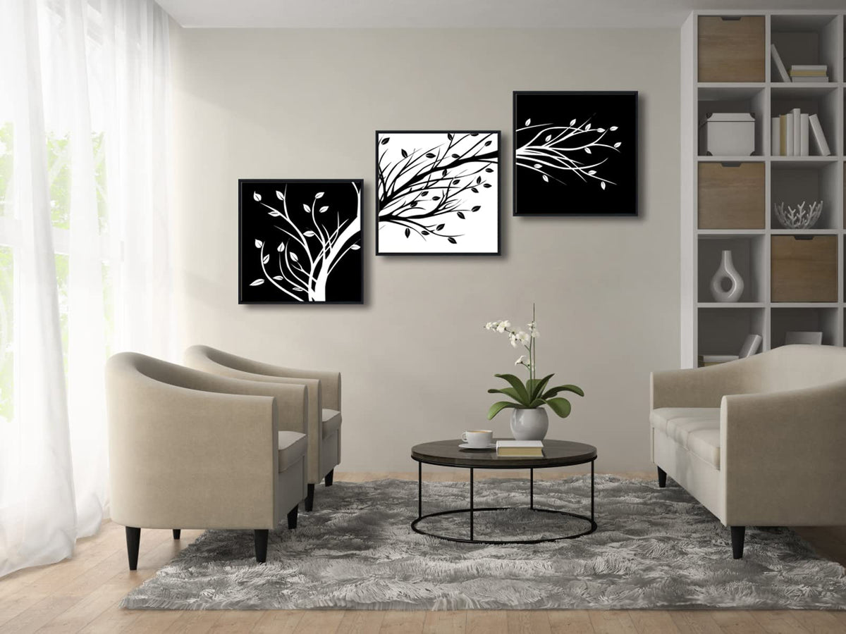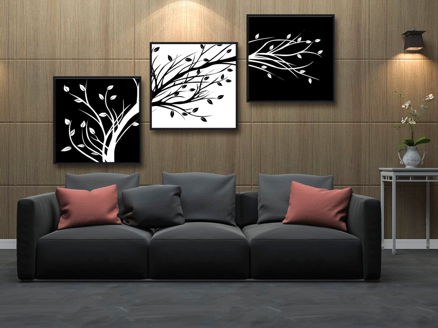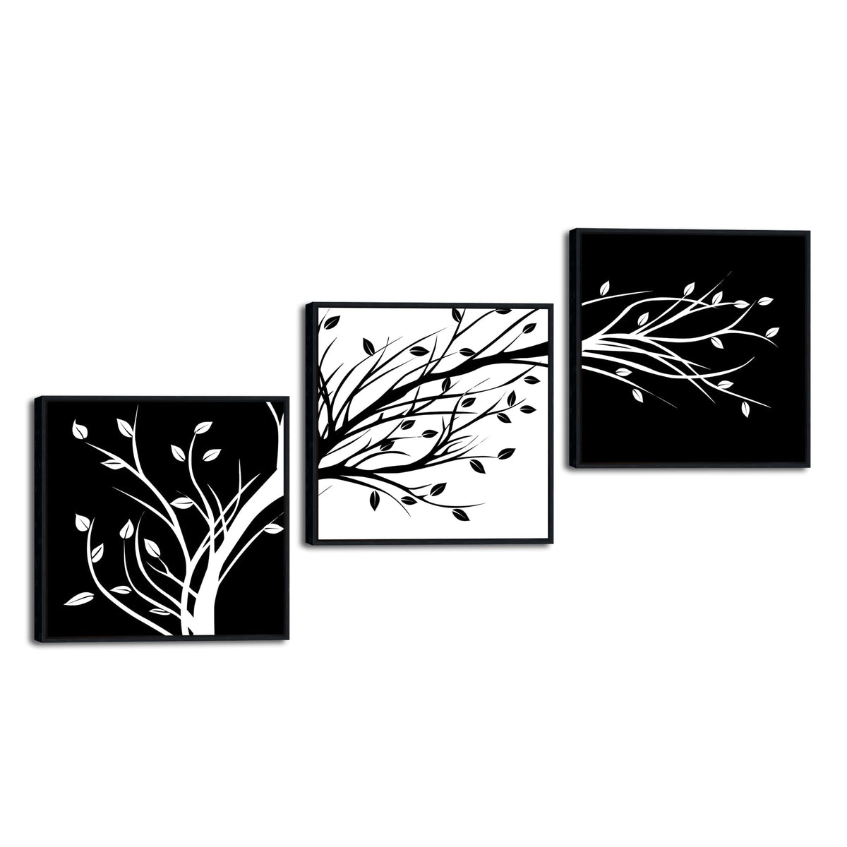 Wieco Art Black Framed Leaves Modern 3 Panels Flowers Artwork Black And White Abstract Floral Trees Canvas Prints Wall Art For L