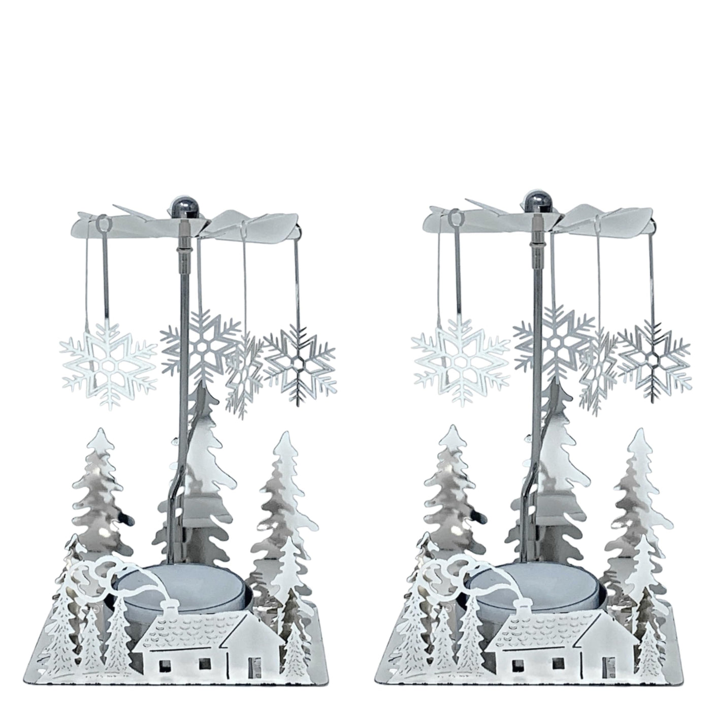 Winter Cabin Holiday Silver Candle Spinners - Silver Plated Laser Cut Winter Scene Cabin Trees Design with Snowflake Charms - Te