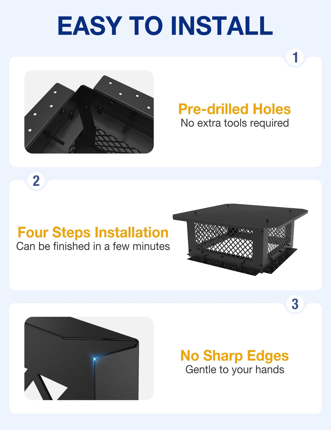- Q: Is the chimney cap easy to install? A: Yes, the chimney cap comes with pre-drilled holes for easy installation by one person without the need for extra tools.