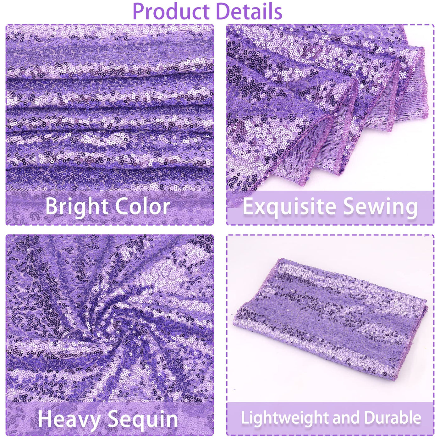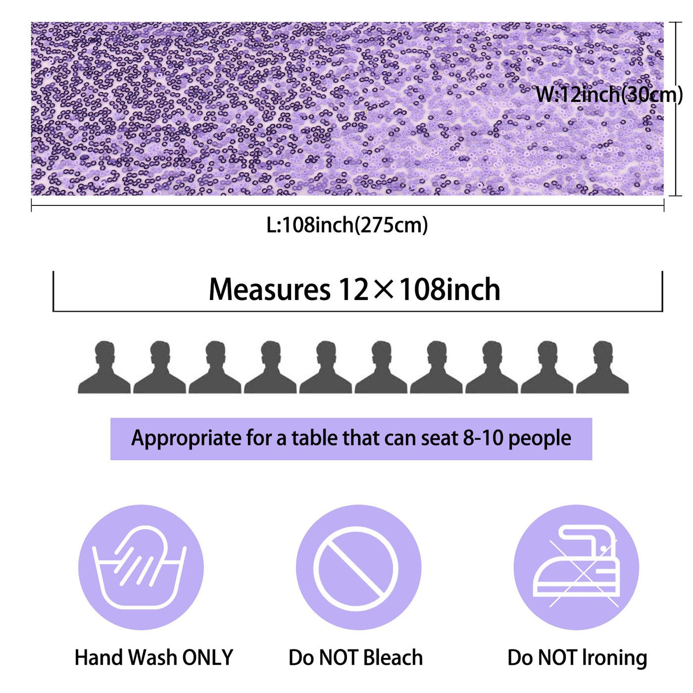 - Q: How many pieces are included in a package? A: The package includes 12 pieces of lavender sequin table runners.
