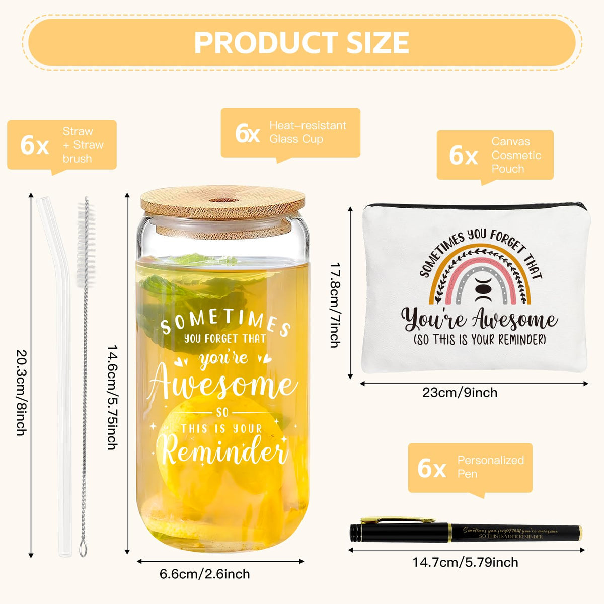 - Q: What items are included in the 6 Set Employee Appreciation Gifts? A: The set includes 6 pieces of 16oz glass cups with lids and straws, 6 cosmetic bags, and 6 ballpoint pens.