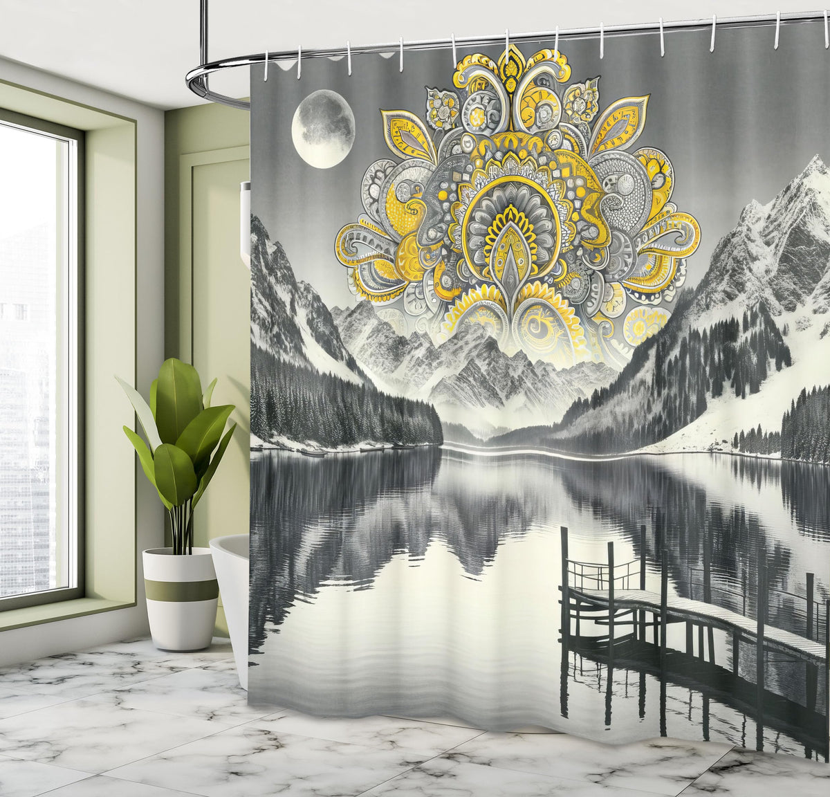 - Q: What is the design of the shower curtain? A: The shower curtain features a mandala-inspired motif along with a mountains panorama in grayscale achromatic colors.
