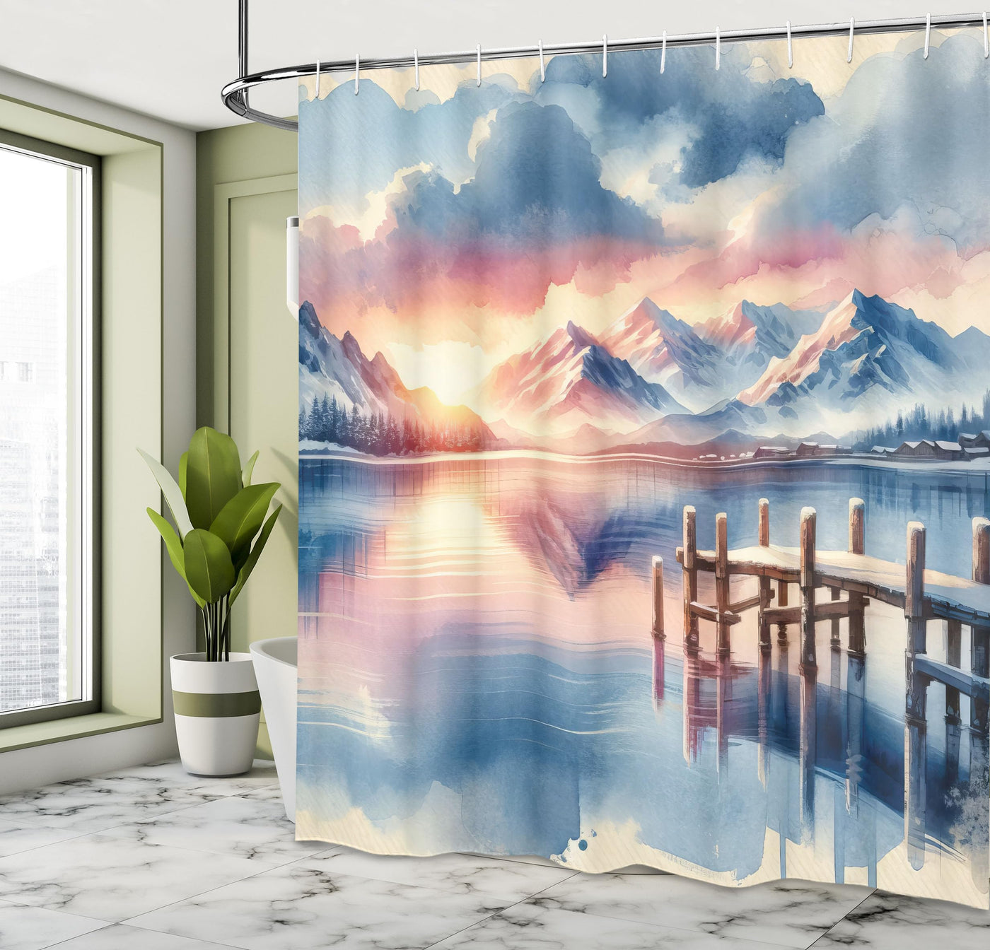 Ambesonne Lake Shower Curtain, Pastel Colors Landscape With Clouds Sunset Sky Mountains Serene Winter Pier, Cloth Fabric Bathroo