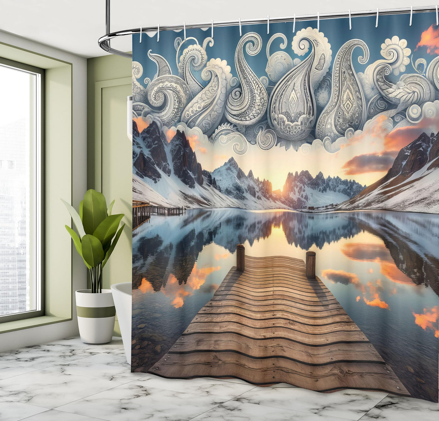 Ambesonne Lake Shower Curtain, Sunset Over Snowy Mountains And Pier Traditional Paisley Motifs In The Sky, Cloth Fabric Bathroom