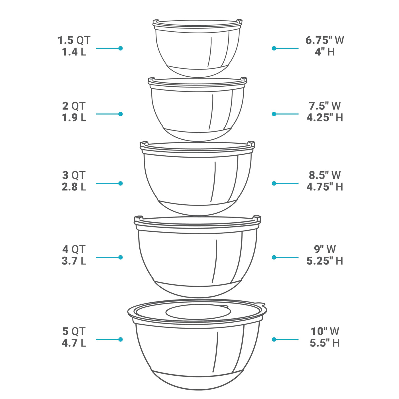 • Q: Do the bowls have measurement markings? A: Yes, each bowl features interior measurement indicators in quarts and liters for easy recipe following.