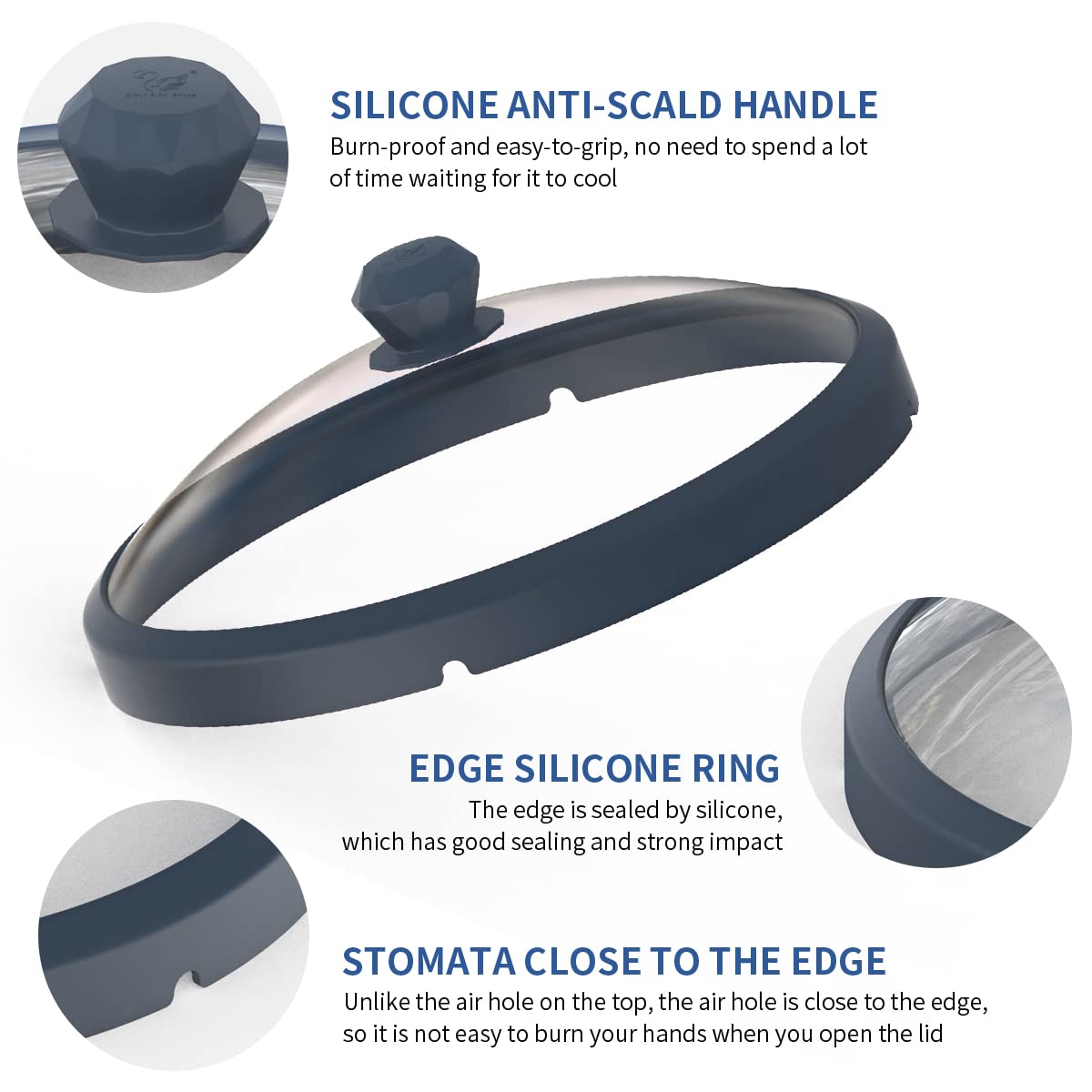 • Q: What makes this lid safe to use? A: The lid is designed with a heat-resistant silicone handle and an air hole near the edge to prevent burns when opening.