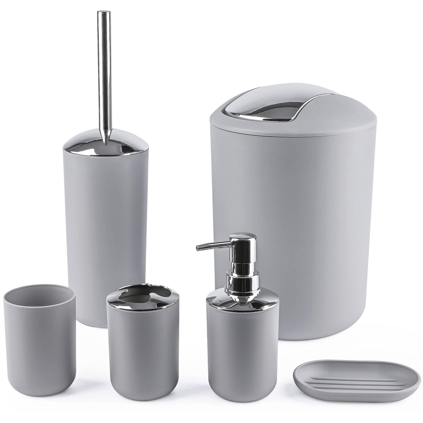 - Q: What items are included in the 6-piece bathroom accessories set? A: The set includes a soap dispenser, toothbrush holder, toothbrush cup, soap dish, toilet brush holder, and a trash can.