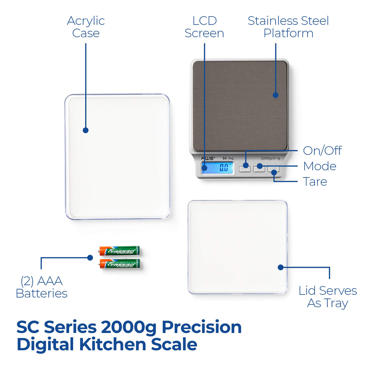Sc Series Precision Digital Kitchen Weight Scale, Food Measuring Scale, 2Kg X 0.1G (Silver), Amw-Sc-2Kg - American Weigh Scale