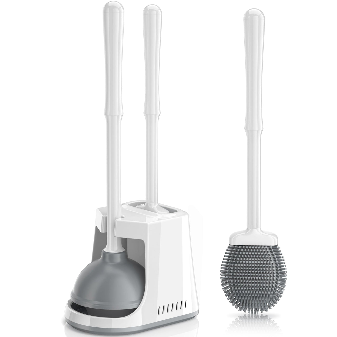 • Q: What is included in the Unique Toilet Plunger and Brush set? A: The set includes a flexible silicone toilet brush, a powerful toilet plunger, and a unique ventilated holder designed for compact storage and easy access.