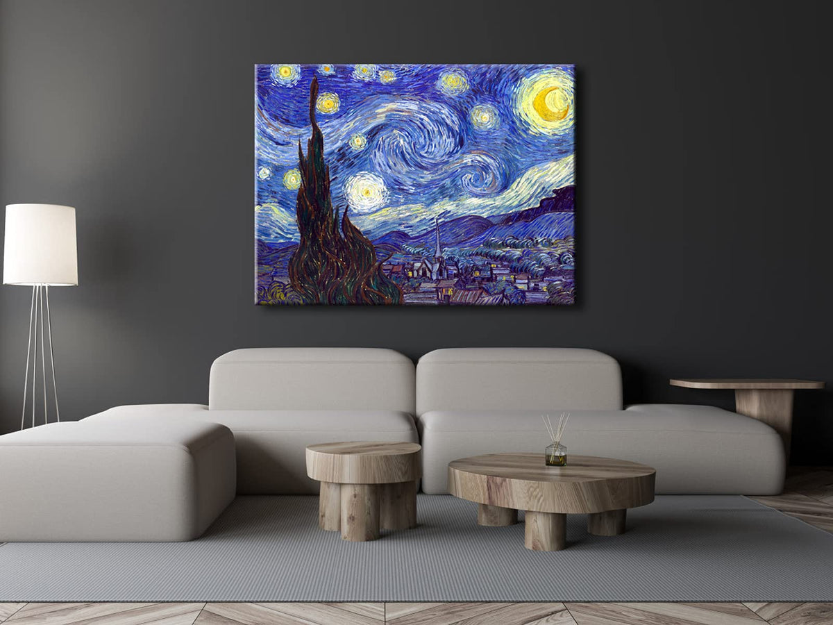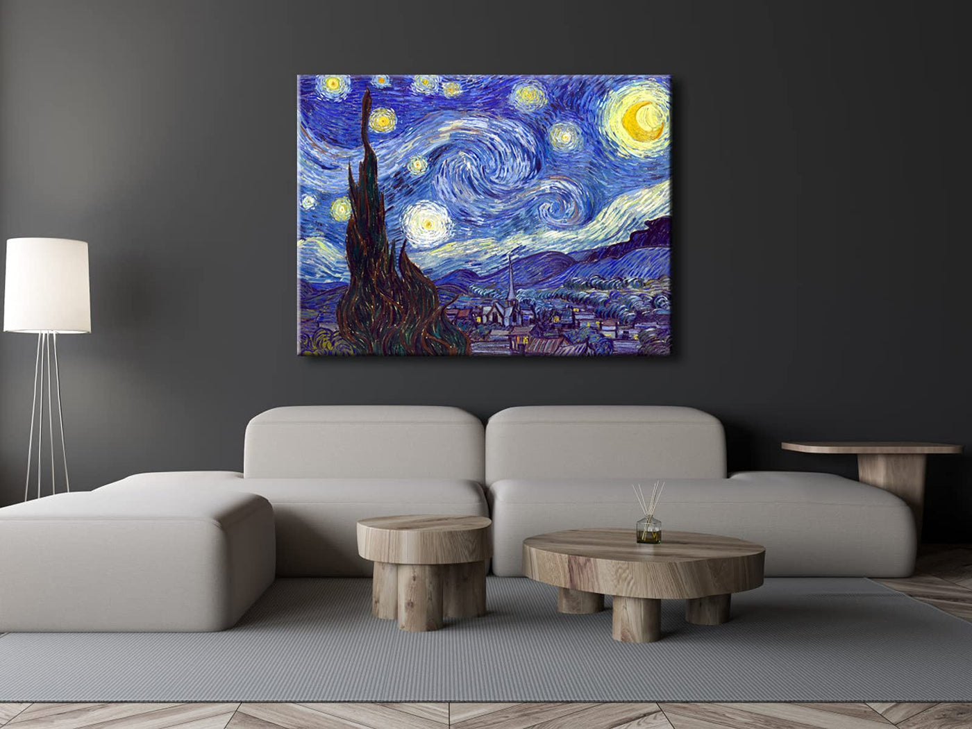 • Q: What type of artwork is featured in this print? A: This print features the famous artwork 'Starry Night' by Vincent Van Gogh, showcasing a modern blue impressionist sky.