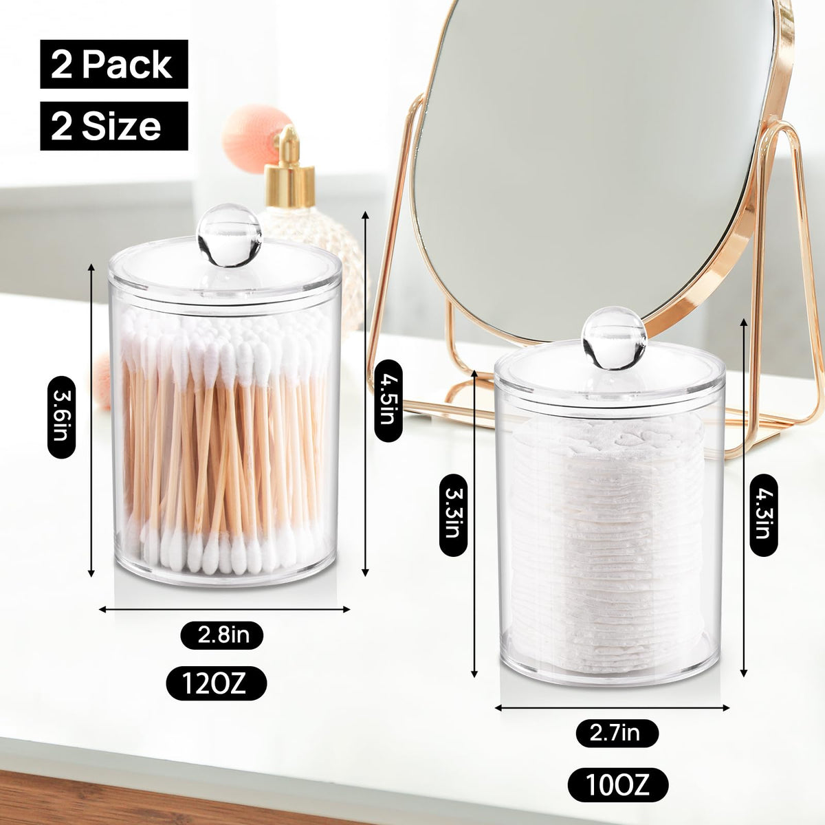- Q: What sizes do the Qtip holders come in? A: The Qtip holders come in two sizes: a 10 oz jar with a diameter of 2.7 inches and a height of 4.3 inches, and a 12 oz jar with a diameter of 2.8 inches and a height of 4.5 inches.