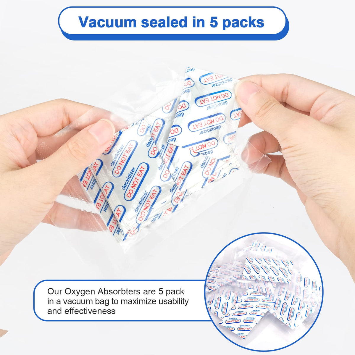 • Q: How are the oxygen absorbers packaged? A: The absorbers are packaged in sets of five and are heat sealed immediately after production to prevent exposure to oxygen and maximize their effectiveness.