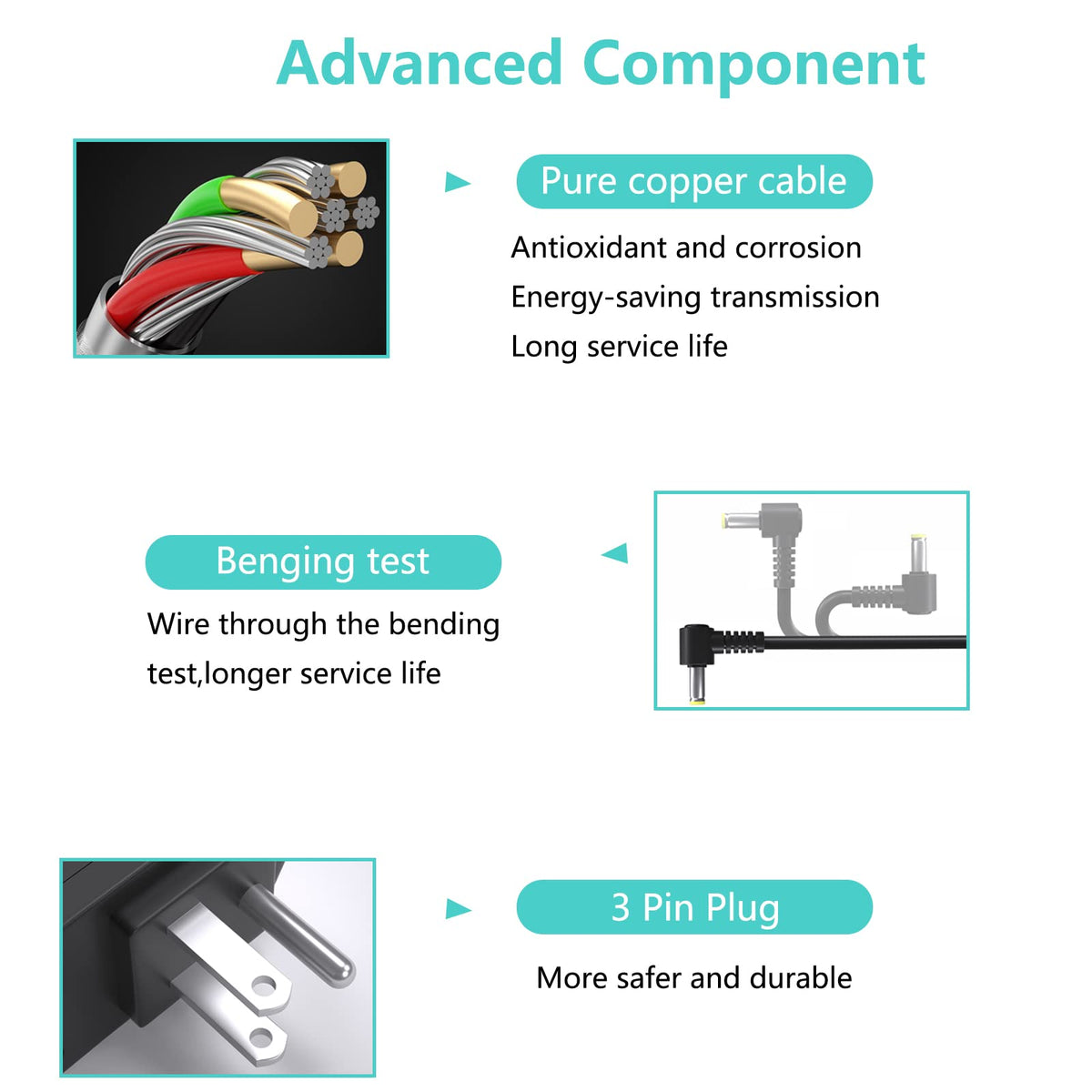 - Q: How does this power adapter ensure safety and reliability? A: This power adapter undergoes multiple tests for safety and includes features like over voltage protection, over current protection, and short-circuit protection.