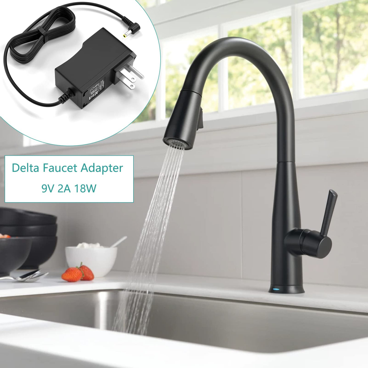 - Q: What precautions should I take when using this power supply? A: Make sure to plug the adapter into a non-switched 110-240Volt outlet under your sink, and keep the batteries installed in the faucet for backup power.