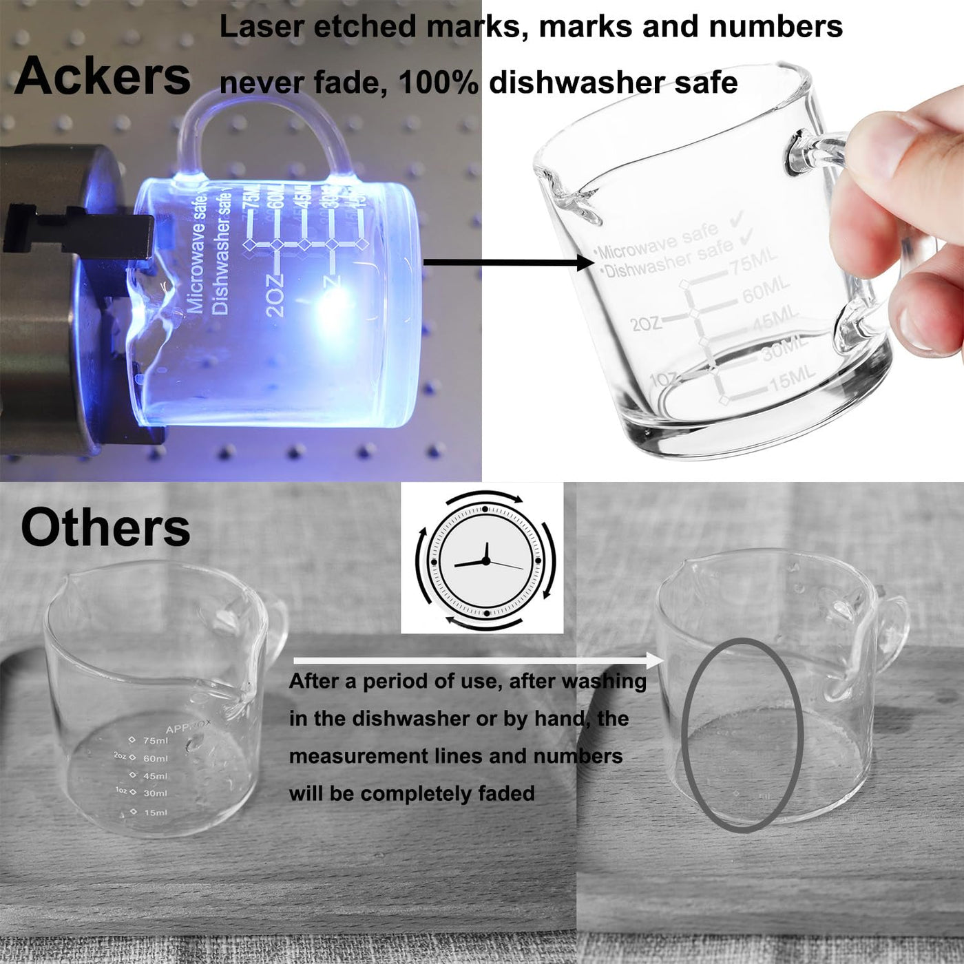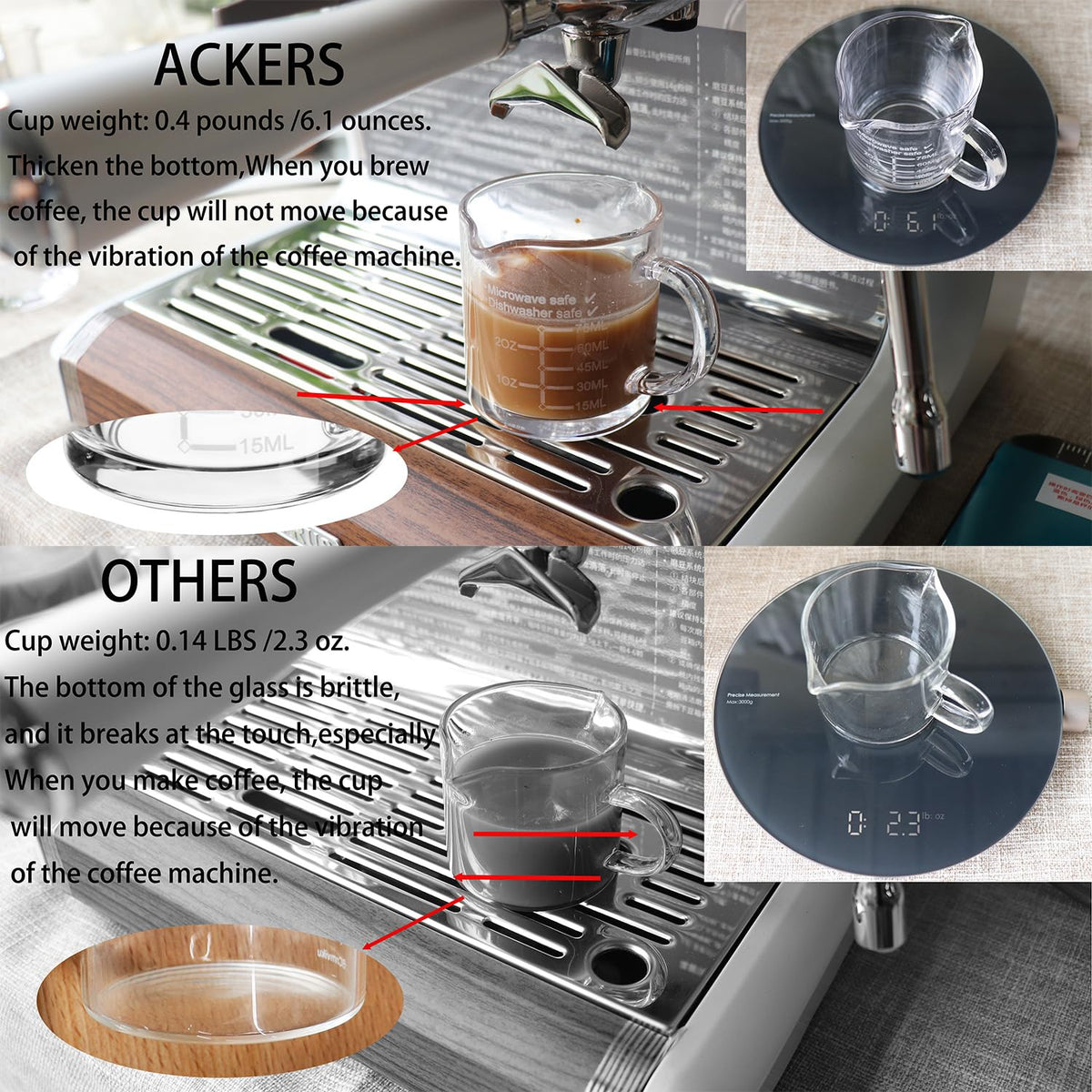 - Q: What is the capacity of the Ackers Etched Scale Espresso cup? A: The Ackers Etched Scale Espresso cup has a capacity of 2.5 ounces, which is ideal for serving a single espresso shot.