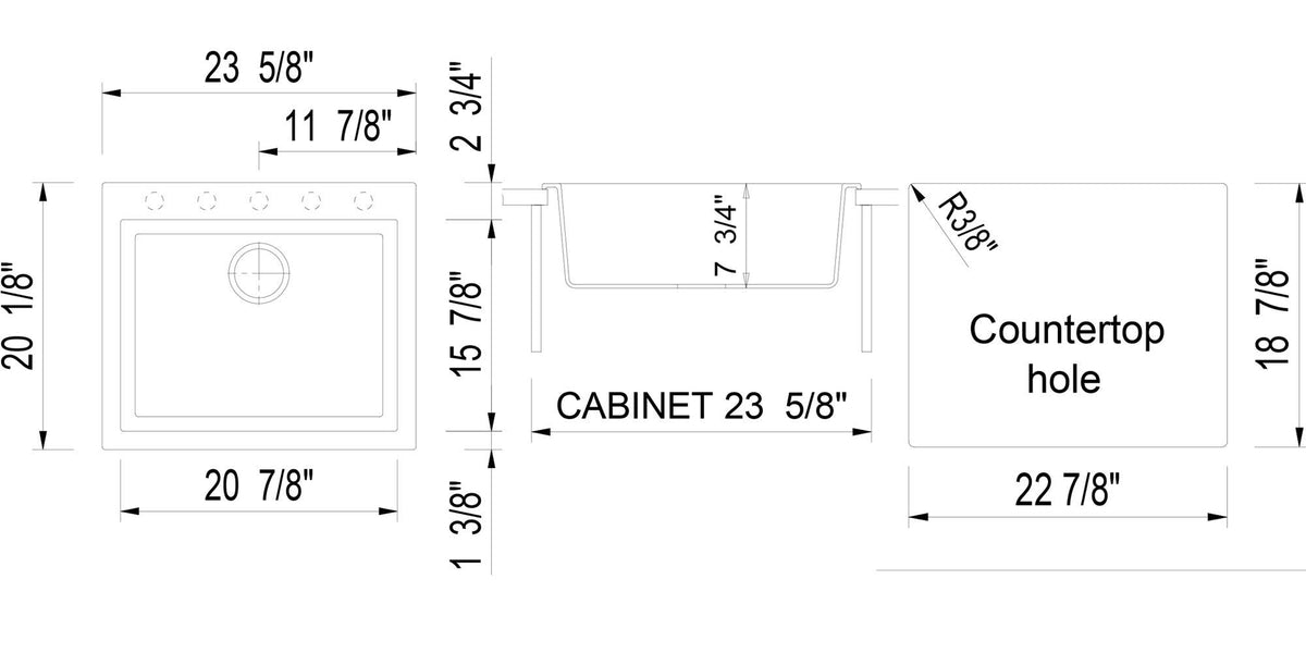 • Q: What are the dimensions of the ALFI brand AB2420DI-BLA sink? A: The exterior dimensions of the ALFI brand AB2420DI-BLA sink are 23 and 5/8 inches by 20 and 7/8 inches by 8 and 1/4 inches. The inner bowl size is 20 and 7/8 inches by 15 and 15/16 inches by 7 and 7/8 inches.